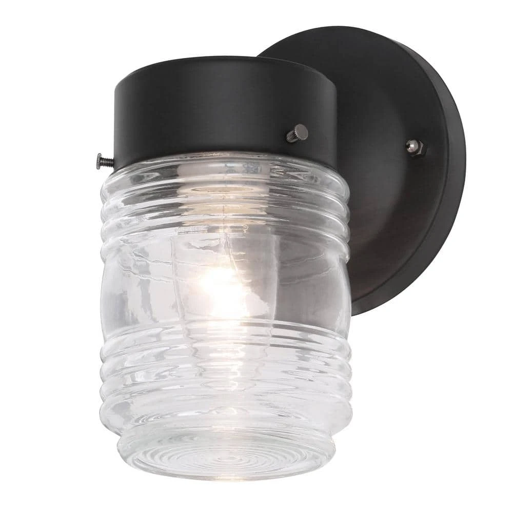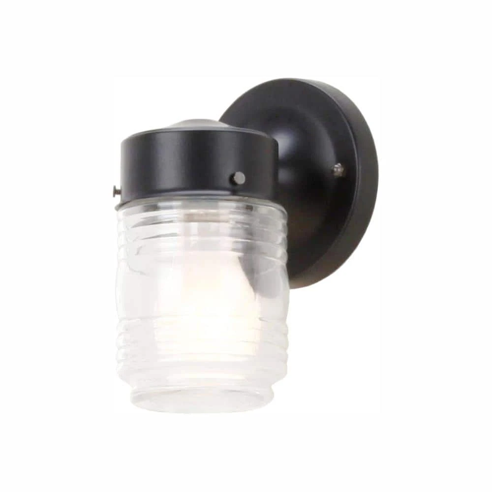 The Hampton Bay Outdoor Matte-Black Jelly-Jar Wall Light is perfect for back doors or side-entry’s. This traditional and versatile lantern compliments a wide variety of home exteriors and styles with its clear glass and jelly-jar design. The durable steel construction and weather resistance make it a utilitarian and affordable choice for your home exterior illumination. Compatible with one 100-Watt maximum bulb (sold separately).