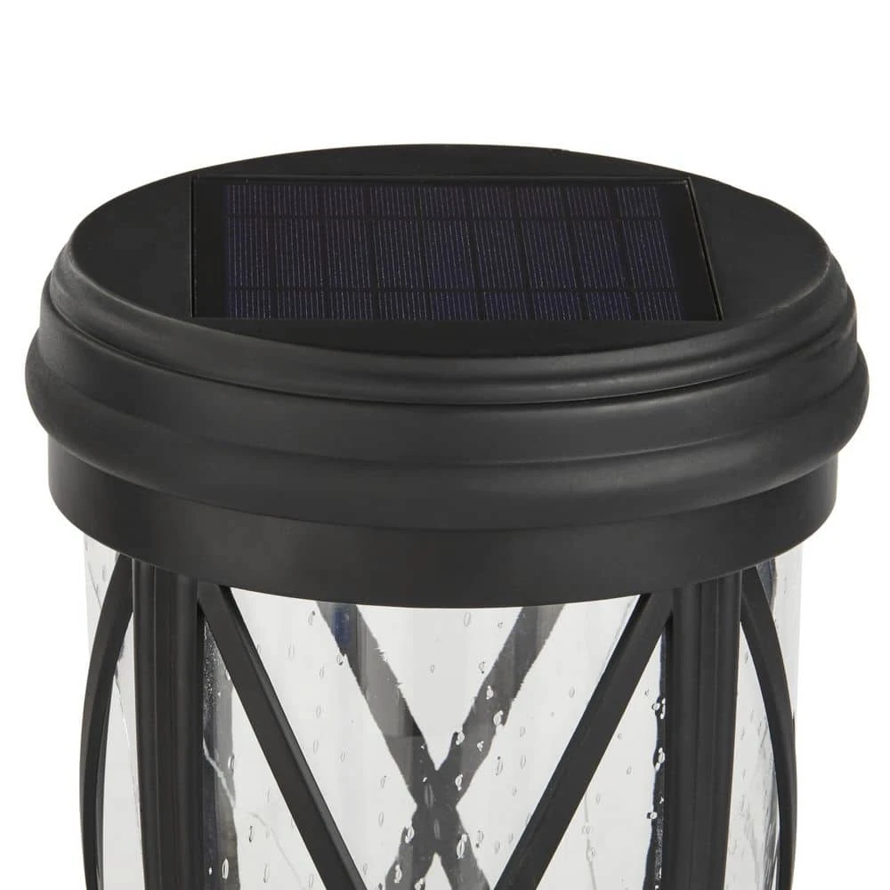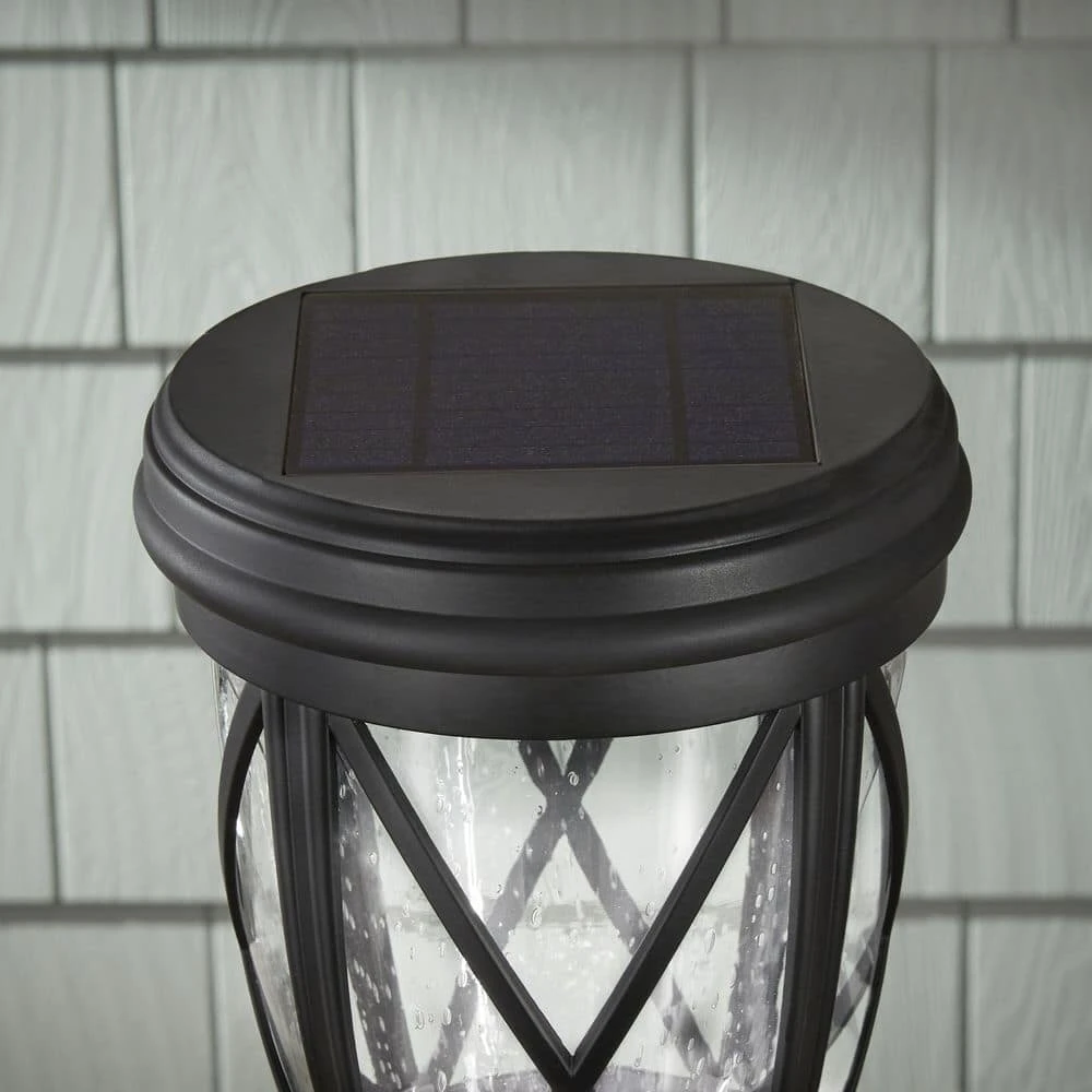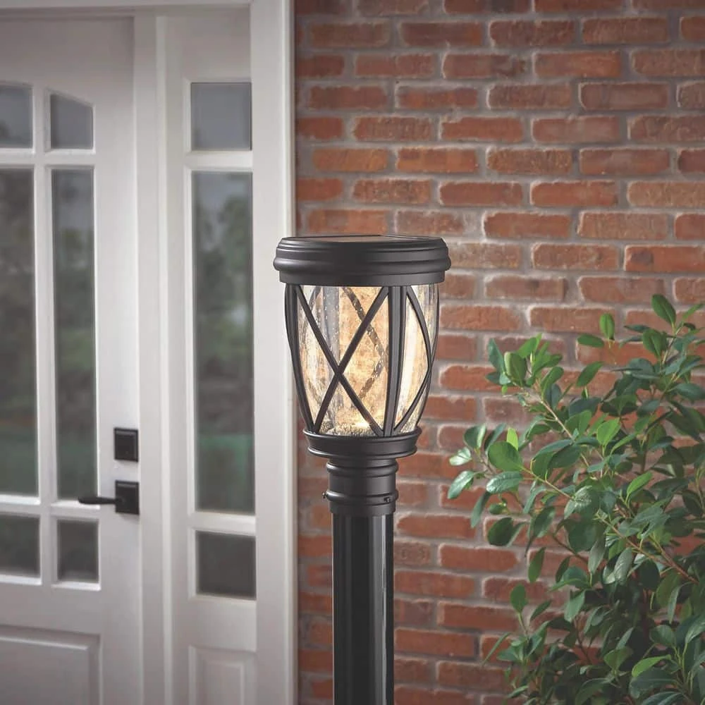 This Hampton Bay Solar Hand-Painted Outdoor Post Lantern with Seedy Glass Shade and 3000K warm white LEDs, creates an impressive addition to any home. Perfect for illuminating exterior walkways, patios and porches. At 139 Lumens, you’ll enjoy 10-hours of uninterrupted illumination. The aged-iron finish is applied to weather-resistant aluminum construction for years of maintenance-free operation (no bulbs to replace). Included with your LED deck light are all necessary hardware and battery(s).