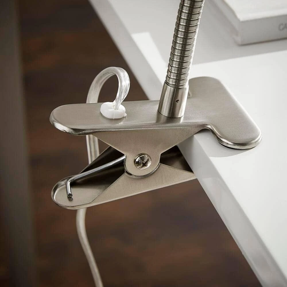 Give ample illumination with the Hampton Bay 13-7/8 in. Satin Chrome Clamp Lamp. It is easy to operate with a classic on/off switch and can clamp to a bed, desktop or other furnishings as a reading light or for computer work. Wherever you need illumination the sleek satin chrome design and finish fits in with your decor.