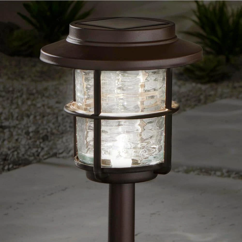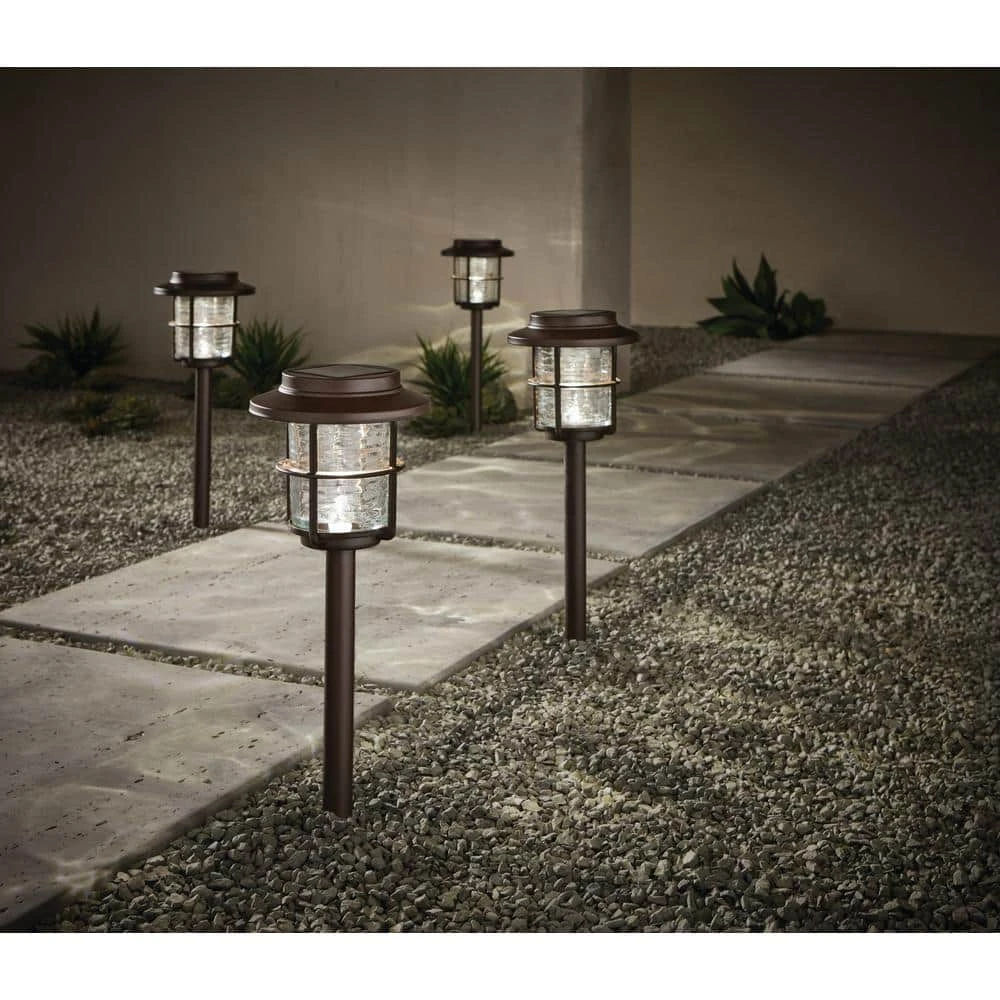 The 4-pack Hampton Bay Solar LED Pathway lights creates bright 3000K warm white lighting that is perfect for illuminating your driveway, walkway, patio or garden. At 15 Lumens, you’ll enjoy 8-hours of uninterrupted illumination. The bronzes finish is applied to a stainless steel top cap and weather resistant polymeric body for years of maintenance-free operation (no bulbs to replace). Included with your LED pathway light are all necessary hardware and battery(s).