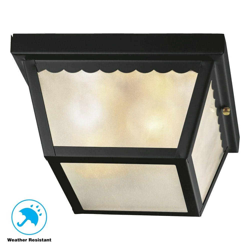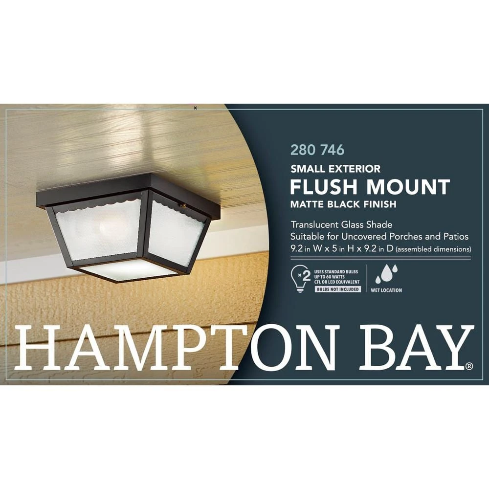 The Hampton Bay 2-light Matte Black Ceiling Mount has a low profile and is ideal for the patio, basement or garage. The translucent glass panels help diffuse the light and are encased in a simple yet stylish black housing. Uses 2-60-Watt light bulbs (not included).