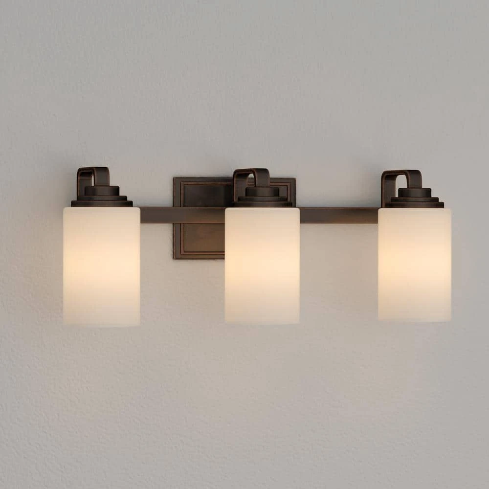 The 3-light vanity is uniquely designed with a contemporary feel. Hand painted in oil rubbed bronze, it provides a clean, yet warm appeal. With the unique design of frosted patterned glass shade, it will provide rich illumination. This unique designed vanity is the choice of discriminating yet value conscious homeowners who want to enrich their home.