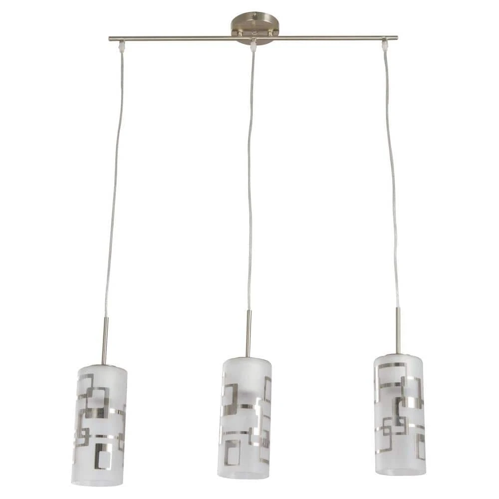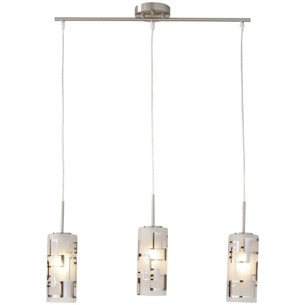 Modern pattern 3-Light ceiling mount mini pendant featured with brushed nickel trim and frosted white glass with modern chrome accents. This beautiful 3 light pendant is a great fit in any modern decor application and a true eye catching beauty. A great fit for any Kitchen Island or dining area.