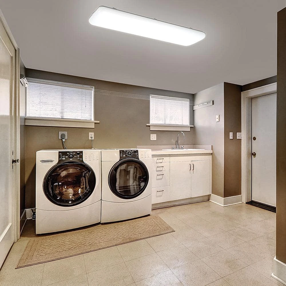 Hampton Bay 4ft x 10in. Rectangular Light Fixture LED Flush Mount is designed to replace outdated 100-Watt fluorescent tube and uses 60% less energy compared to conventional lighting units. It has a durable acrylic smooth lens with crystal-clear illumination and no yellowing over time. Its lightweight construction makes for easy installation while the LED technology ensures eco-friendly, long-lasting service and is maintenance free with no bulbs to replace. Ideal for kitchen, laundry room, garage, basement, storage room, hallways, lobby, warehouse offices and restrooms.