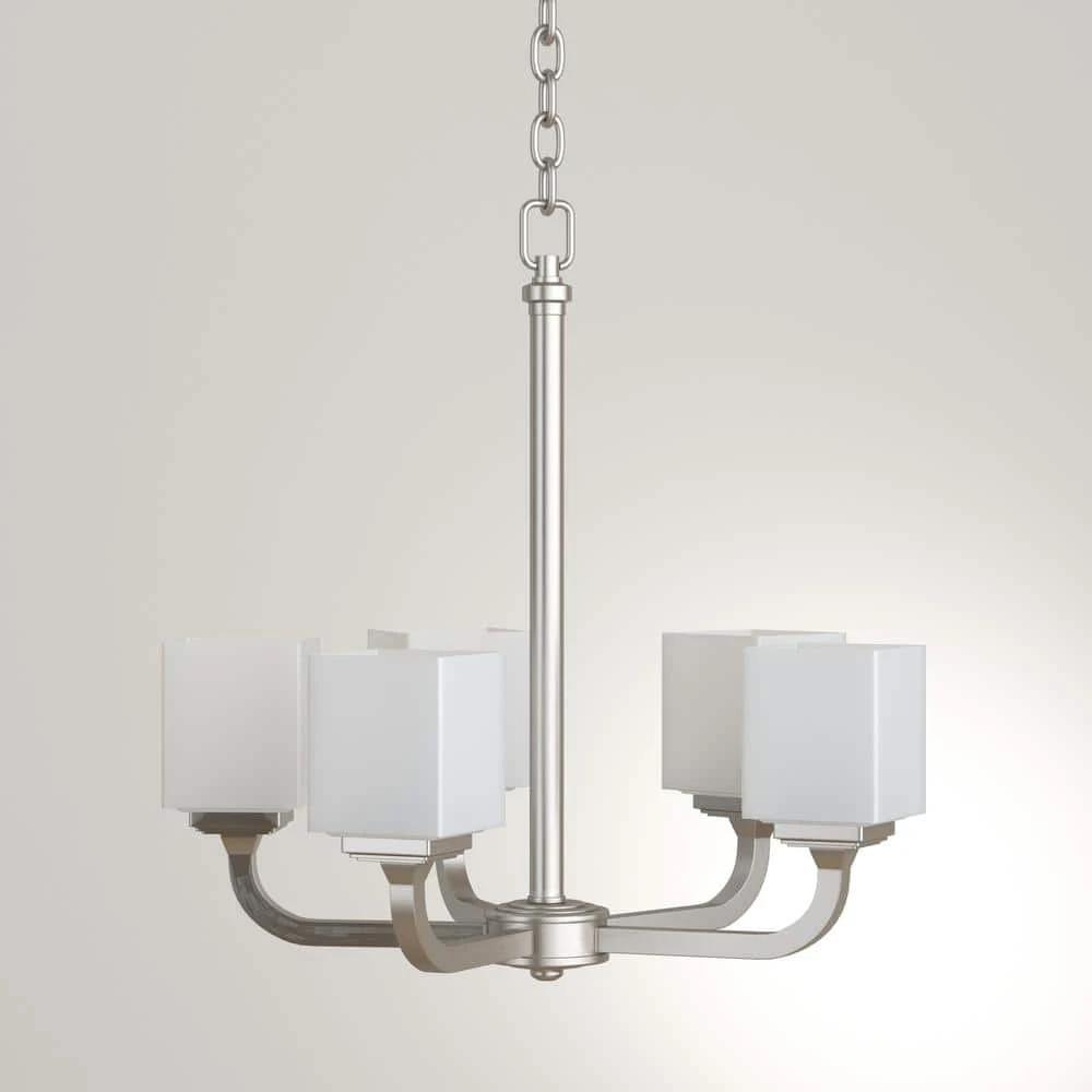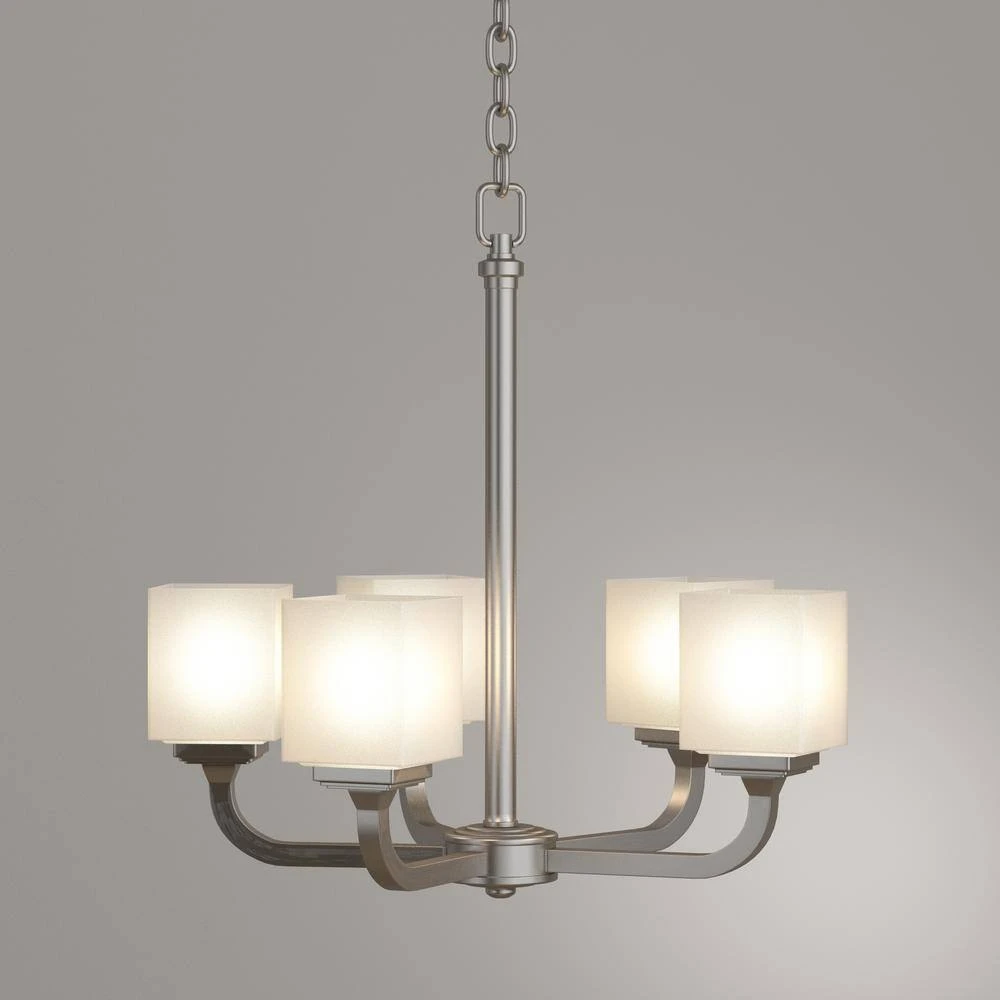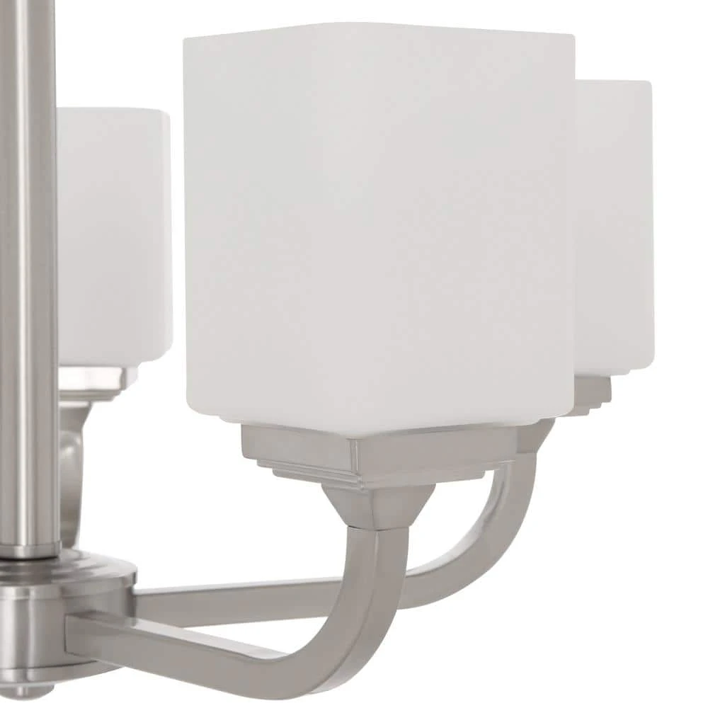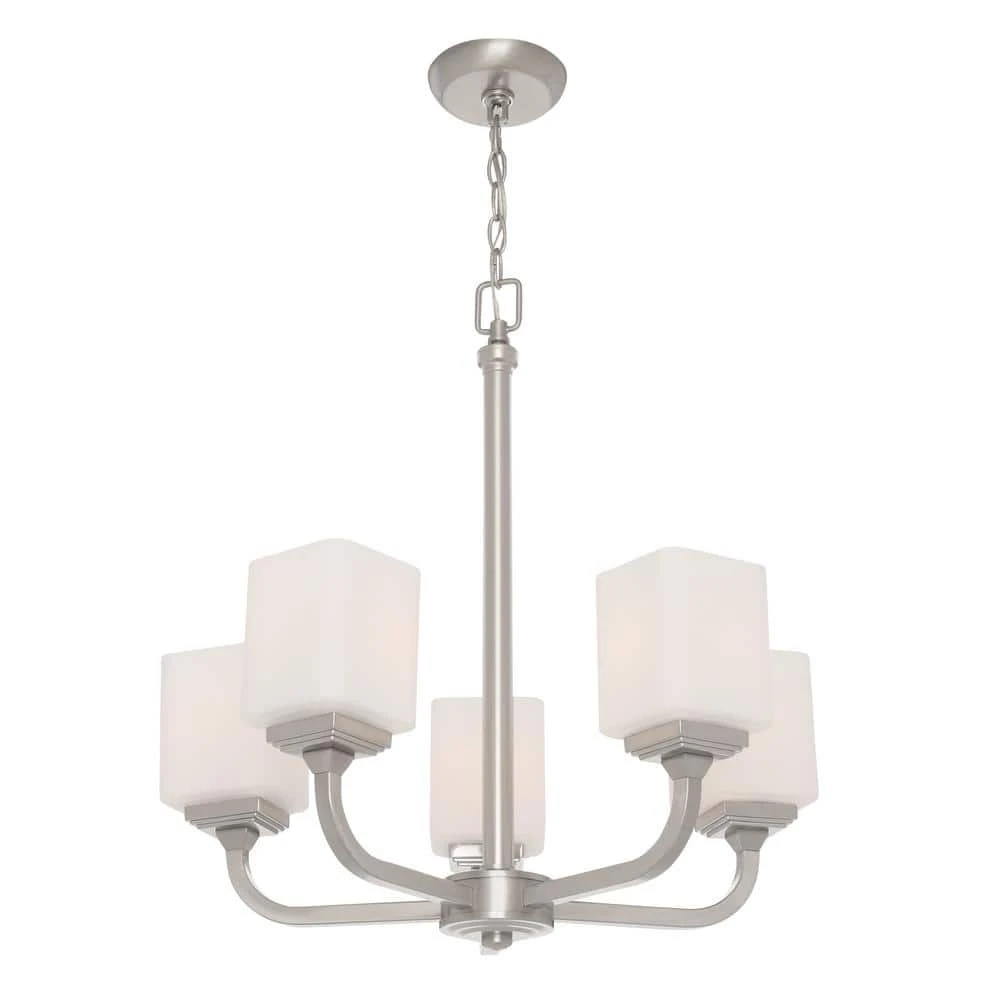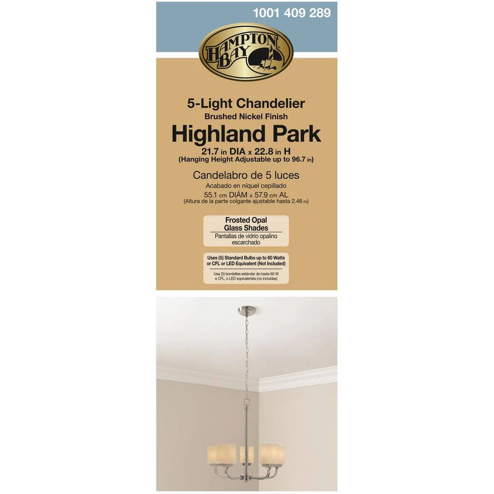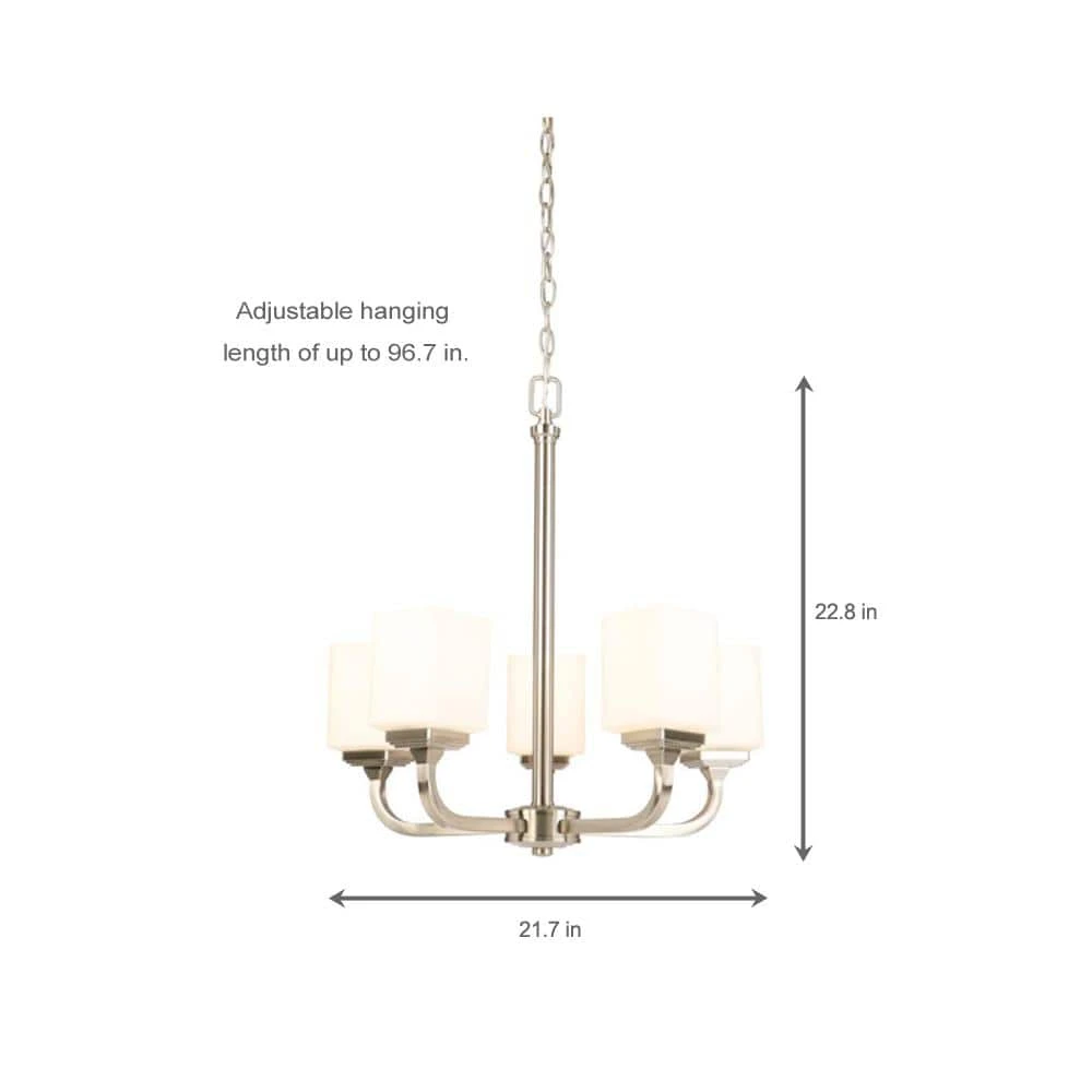 This Hampton Bay 5-light chandelier has a great contemporary design with beautifully constructed clean lines. Finished in brushed nickel, it will be a great additional to any room. It has frosted glass shade to provide pure illumination. This timeless classic design is the choice of discriminating yet value conscious homeowners who want to enrich their home.