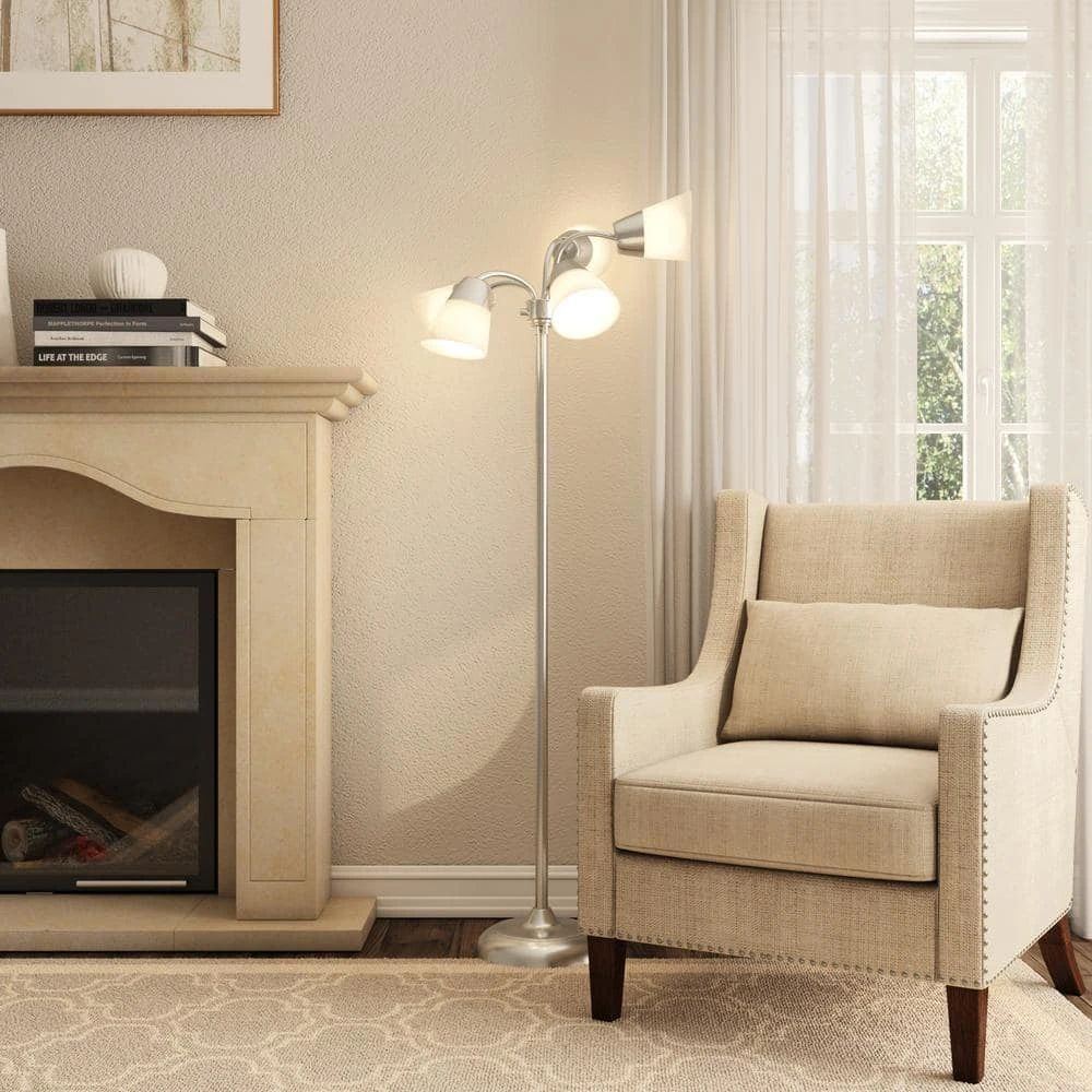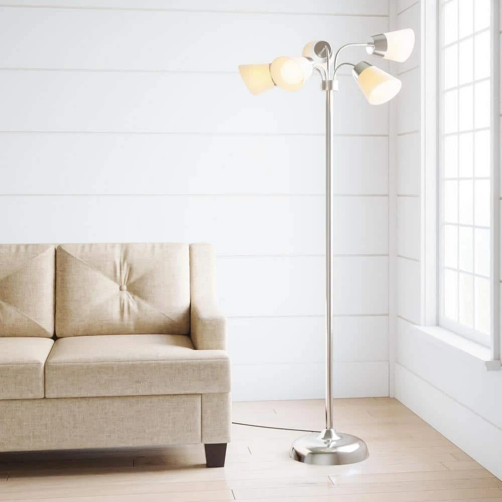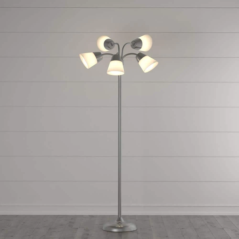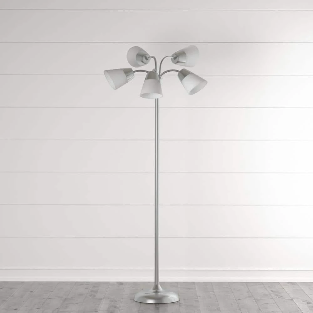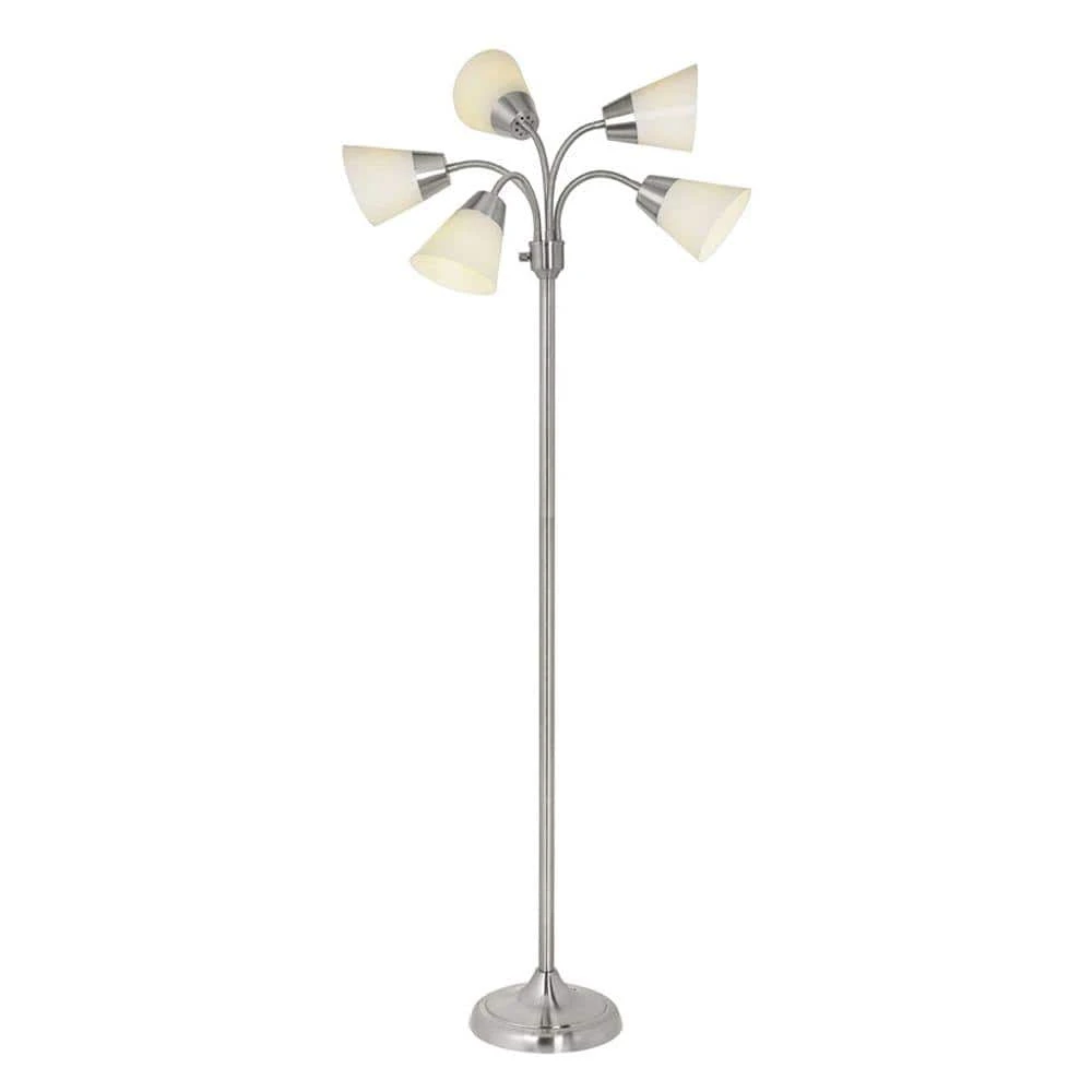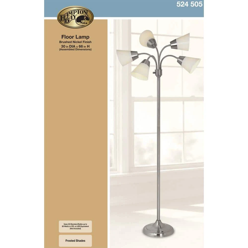 The Hampton Bay 66 in. Floor Lamp is durably built from metal. It features flexible arms and a 4-way switch for adjustable direction and light output. It uses (5) 60-Watt bulbs (not included).