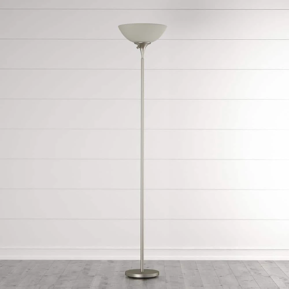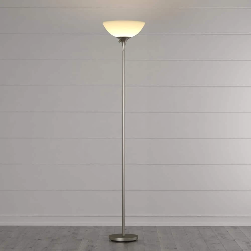 This simple, yet elegant floor lamp is the perfect way to brighten up a room. The contemporary look has a brushed nickel finish with a sturdy frosted white plastic shade. It requires two 150-Watt or CFL equivalent bulbs (not included) and produces 300-Watt of overall room illumination.