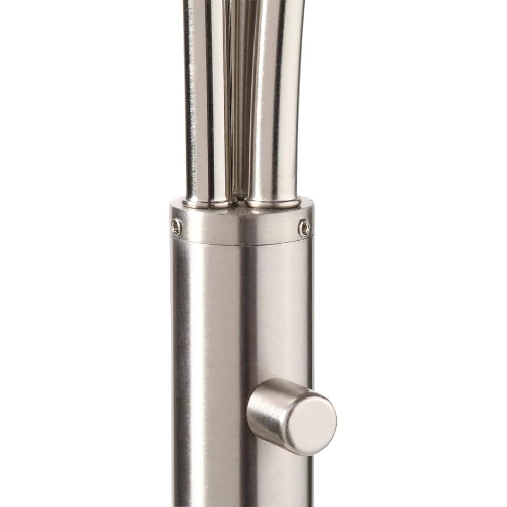 This brushed nickel floor lamp has 3 linen drum shades which suspend from adjustable curved metal poles. It has a rotary switch on the pole and uses three 60-Watt incandescent bulbs or CFL or LED equivalent (not included). It is 80 in. H. This lamp will brighten up any room decor in the house.