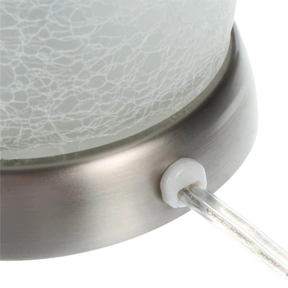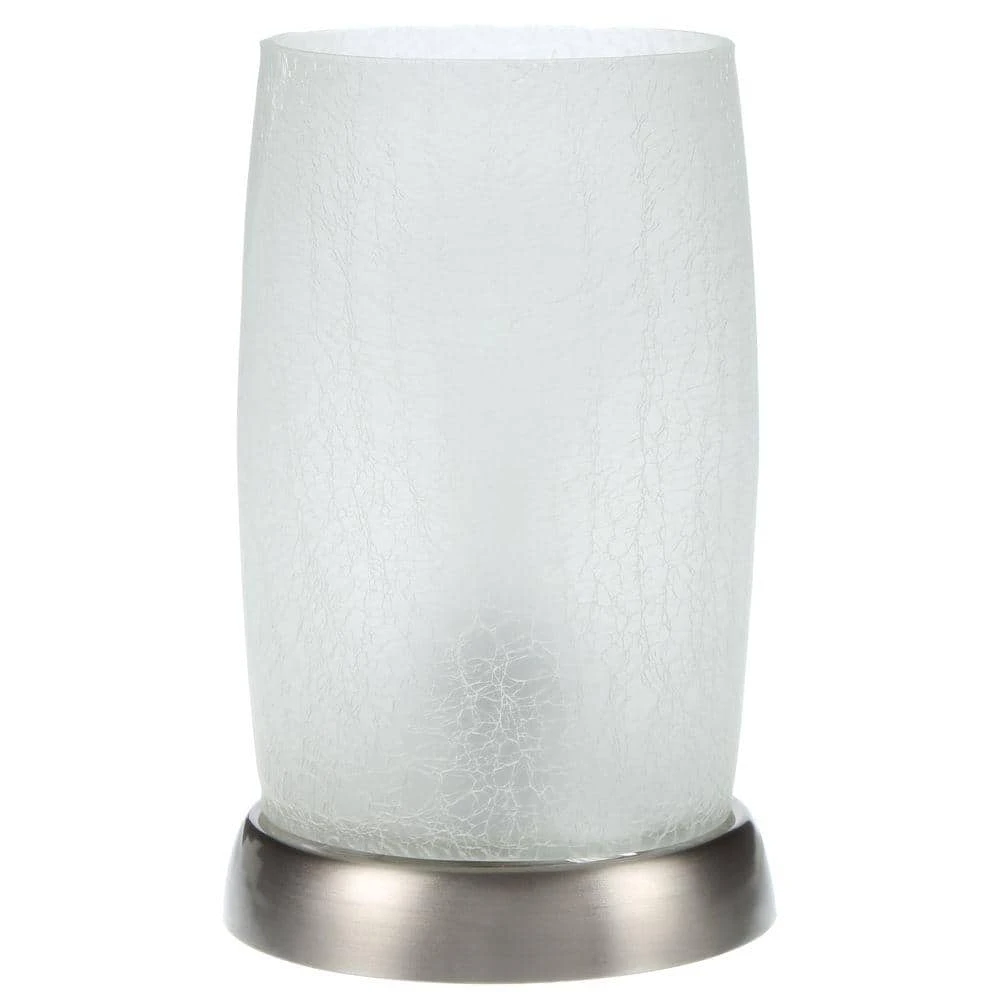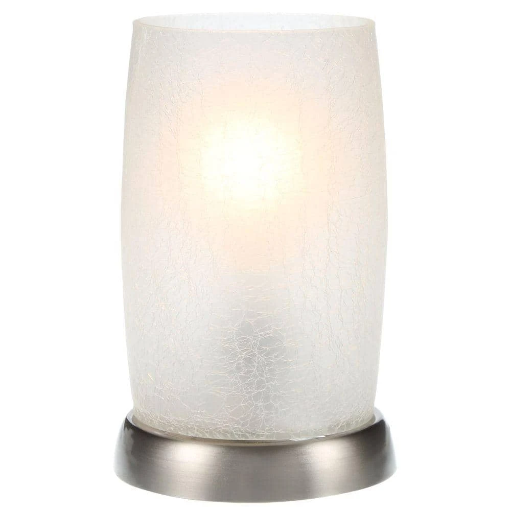 Bring warm light to any design style with the Hampton Bay 8.5 in. Accent Lamp. Featuring a sleek brushed nickel finish and a frosted crackled glass shade, this lamp is ideal for a bedroom, living room or den. Convenient touch control makes it easy to use, and with 3-light intensity levels, this lamp provides evenly dispersed illumination. Add two for a matching look on end tables or bedroom nightstands.