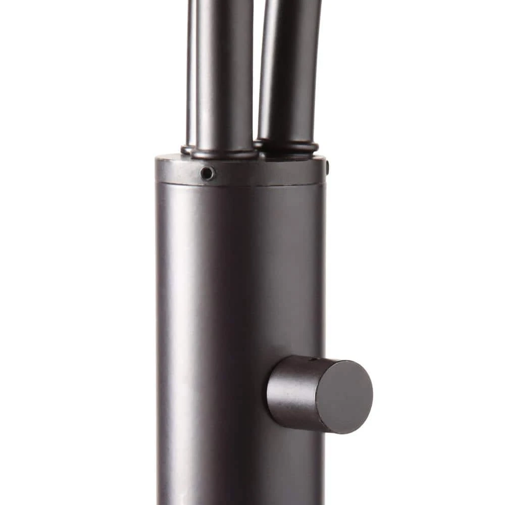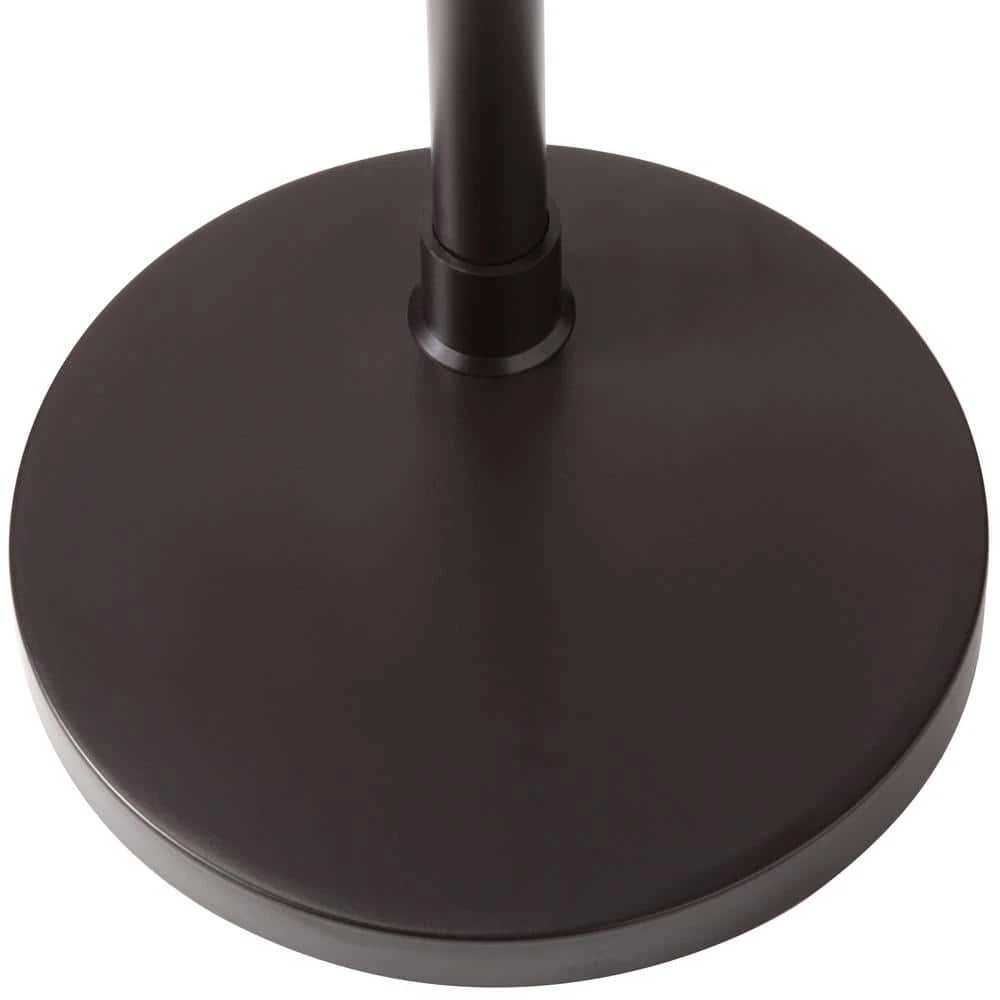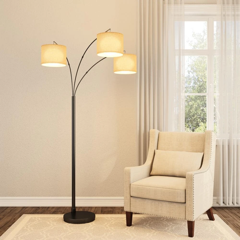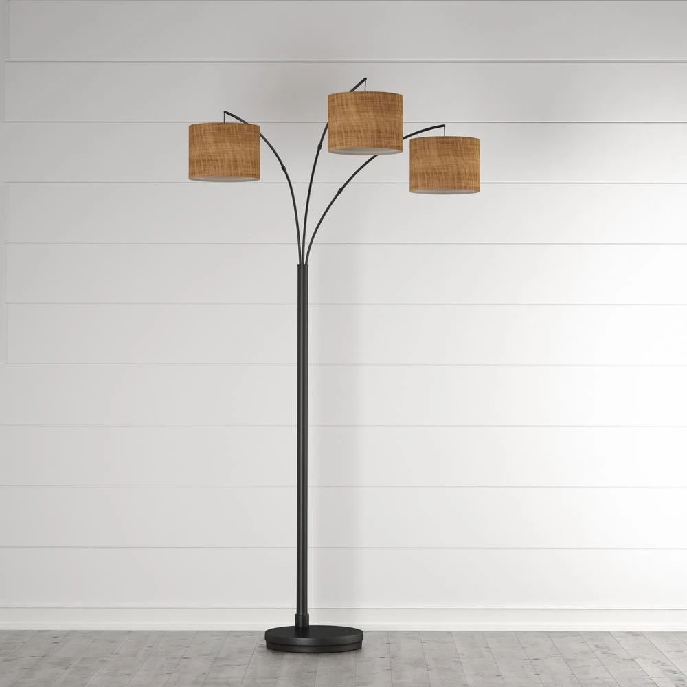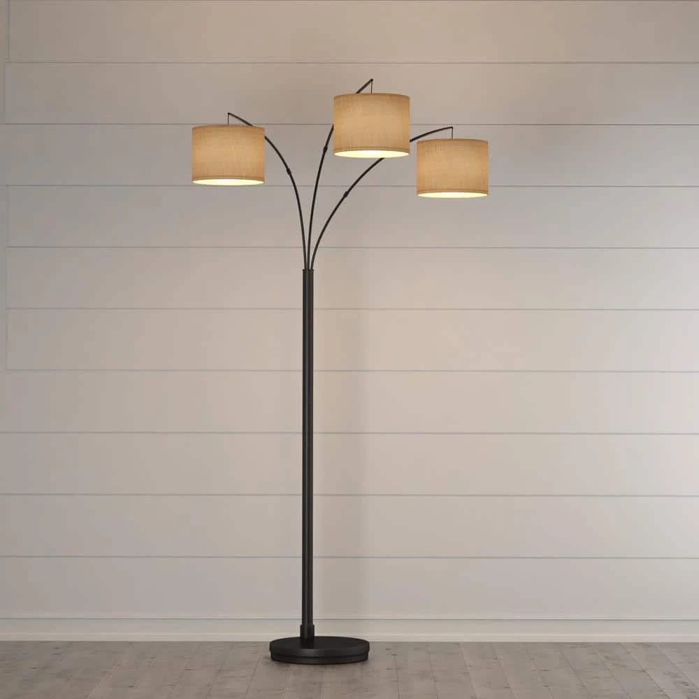 The antique bronze floor lamp has 3 burlap drum shades which suspend from adjustable curved metal poles. It has a rotary switch on the pole and uses three 60-Watt incandescent bulbs or CFL equivalent (not included). It is 80 in. H. This lamp would brighten up any room decor in the house.