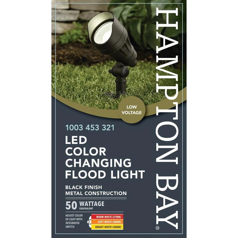 The Hampton Bay Low Voltage 50-Watt Equivalent LED Flood Light offers the option of three light colors. The integrated switch rotates to choose from 2700K Warm White, 3000K Soft White or 4000K Daylight light color. The flood beam angle is perfect for highlighting wide areas, as well as enhancing home security. On any of the 3 light color settings, it consumes over 80% less energy than a typical halogen light and has a rated life of 50,000 hours. The LED system provides maintenance free operation and there are no bulbs to change. With cast aluminum construction, long life powder coat finish and weatherproof electronics, you can count on many years of service. The quick-install wire connector means easy do-it-yourself installation that is quick and safe.