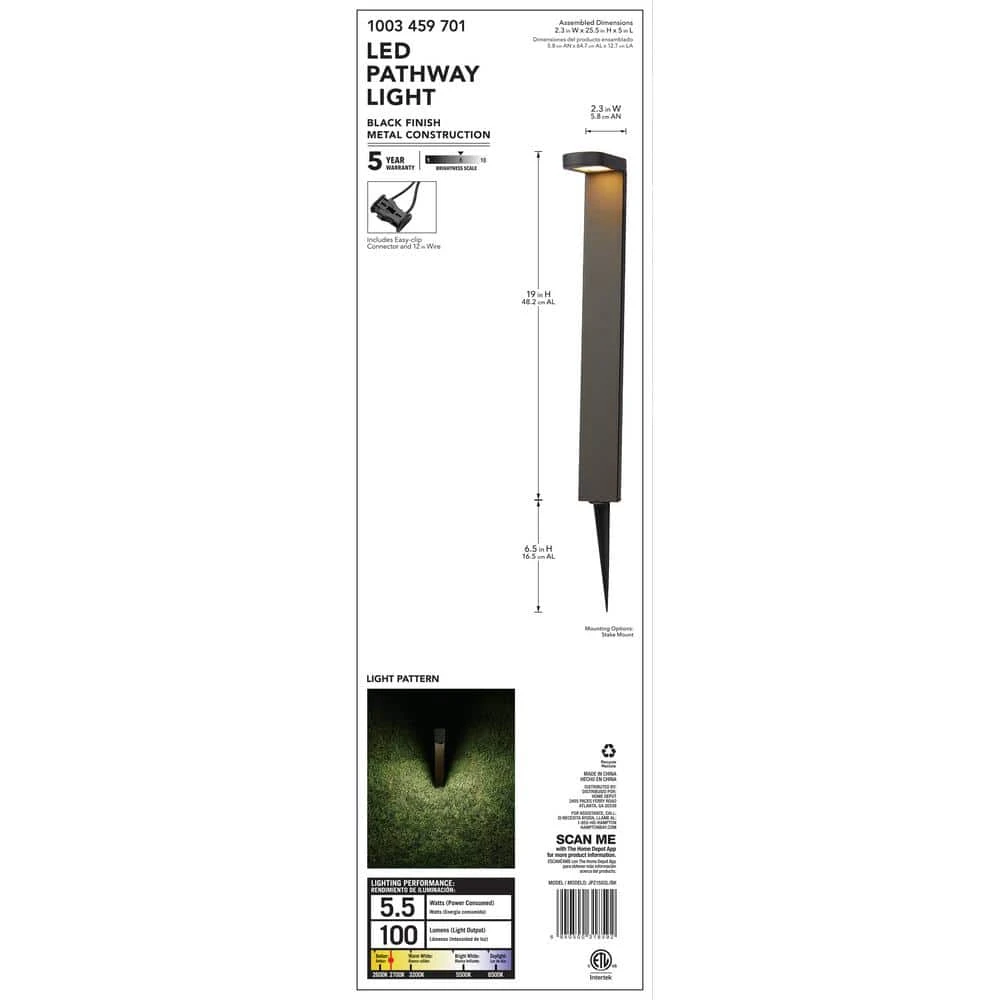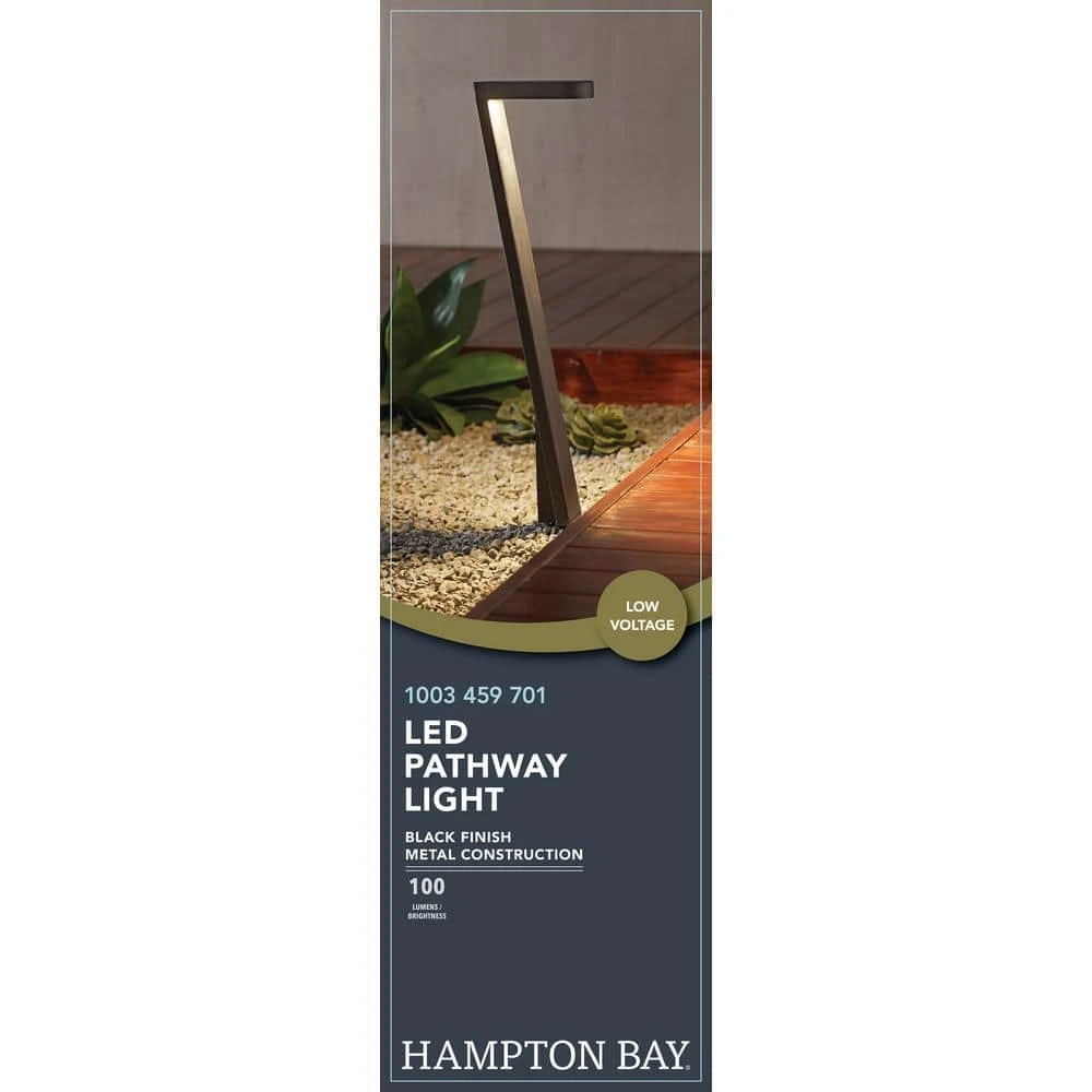 This Hampton Bay Low Voltage Black Outdoor LED Path Light provides the same bright light as a typical halogen landscape path light, but uses over 80% less energy and boasts a rated life of 50,000 hours. The integrated LED light source means maintenance-free operation and no bulbs to change for the entire life of the fixture. Top-quality features include all-metal construction, a long-life powder-coat finish and weatherproof electronics. Do-it-yourself installation is fast, easy and safe. In this fixture the light is directed towards the ground, creating a beautiful pattern of soft light ideal for illuminating steps, pathways and smaller plants, as well as enhancing security.