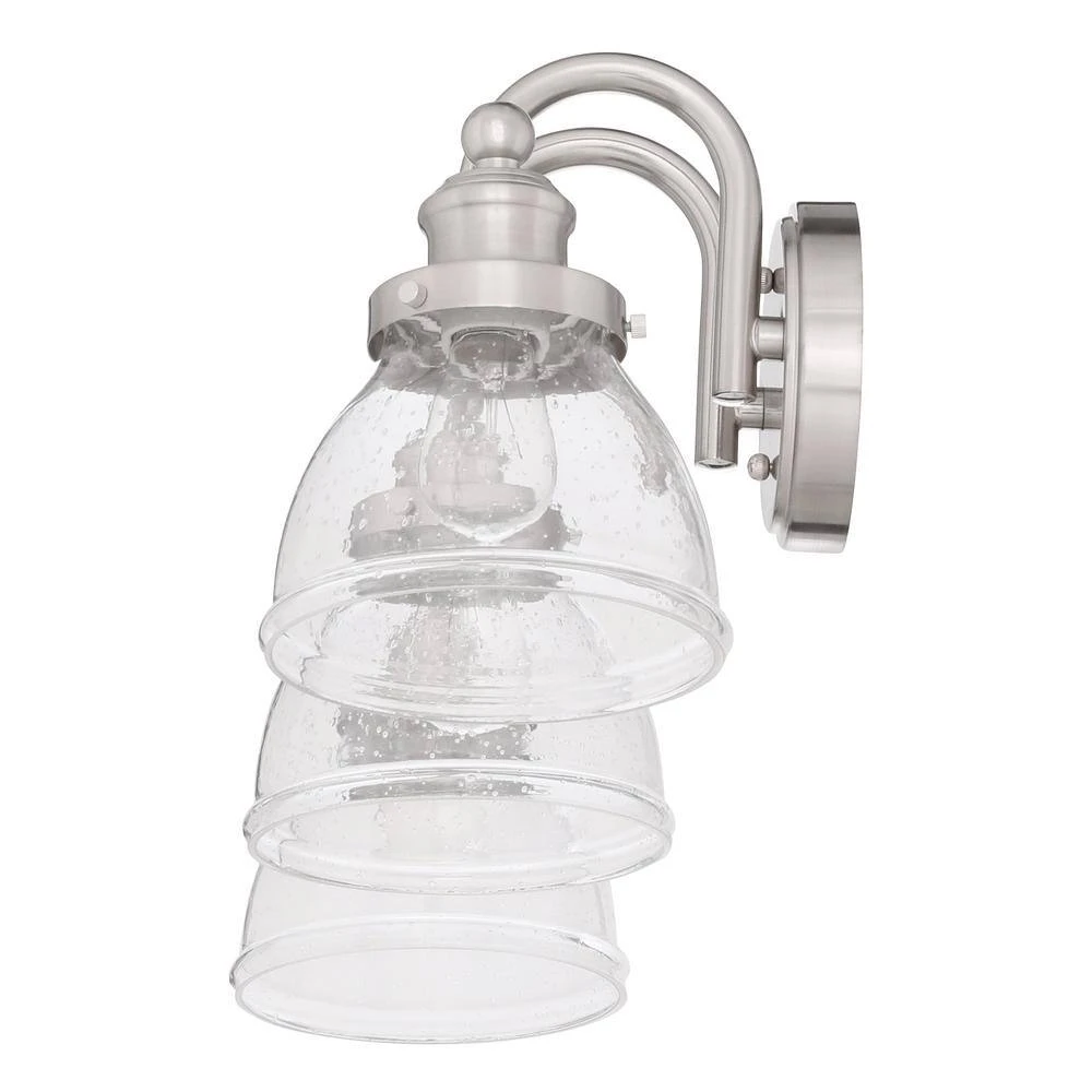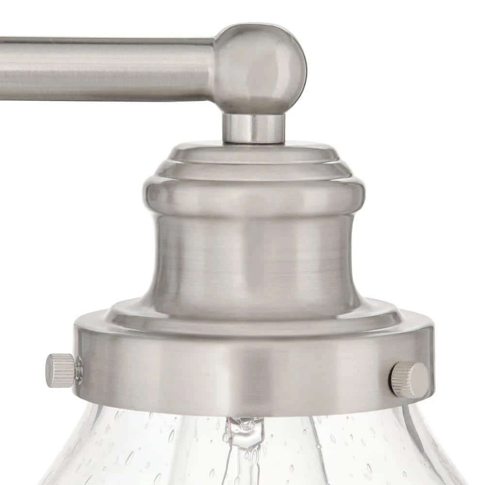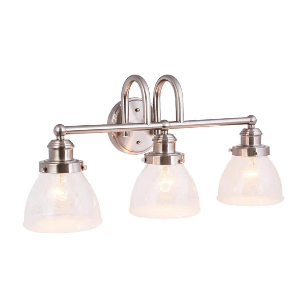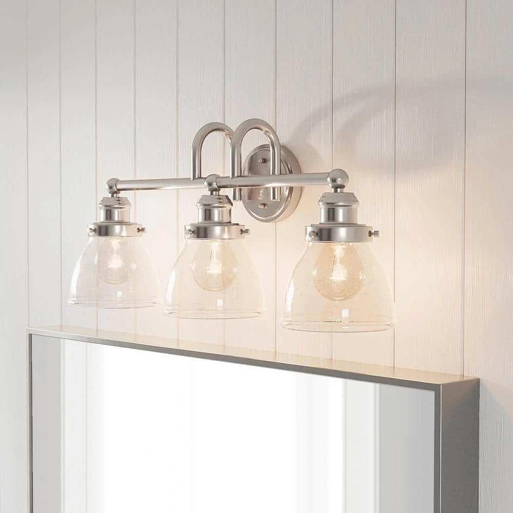 Clear seeded glass shades offset a brushed nickel finish to enhance the timeless style of this 3-Light Vanity Light Bar. Its seamless design features clean lines for a natural, yet decorative, look that will provide functional yet soft light to your home. Whether you prefer traditional or transitional decor, this is the perfect fixture to update any bathroom, or even transform a home bar area. Updating the lighting in your home is the most effective way to accomplish a striking, yet simple, DIY remodel.