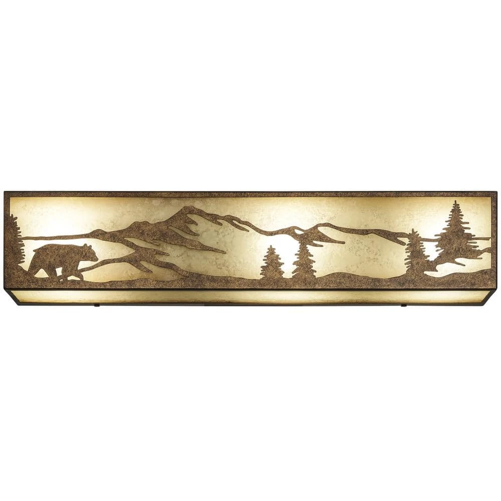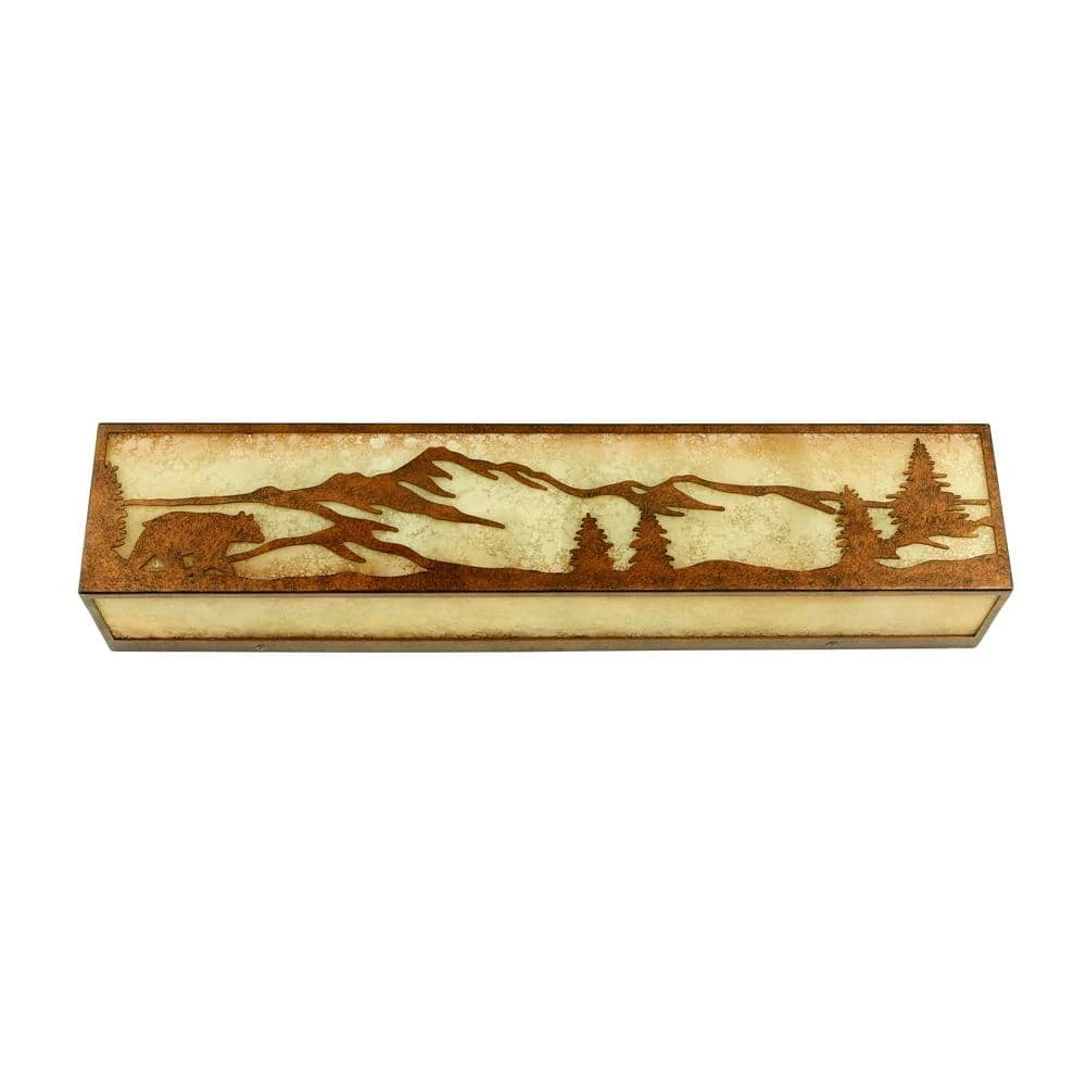 Hampton Bay brings the rustic charm to your decor with the 3-Light rustic bronze vanity light bar. The rustic bronze finish is accented with a sunset glass shade that illuminates the bear silhouette bringing the outdoors inside and gives your hallway, bedroom, bath or powder room a warm glow and a truly unique look. Easy to install, this fixture is also easy to coordinate with the wall sconce-piece for a stylish decor theme throughout your home. Perfect for a mountain cabin or lake house.