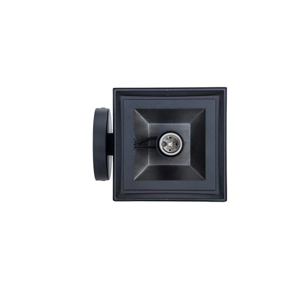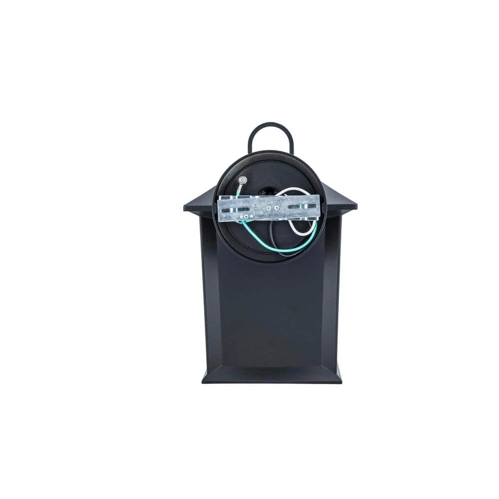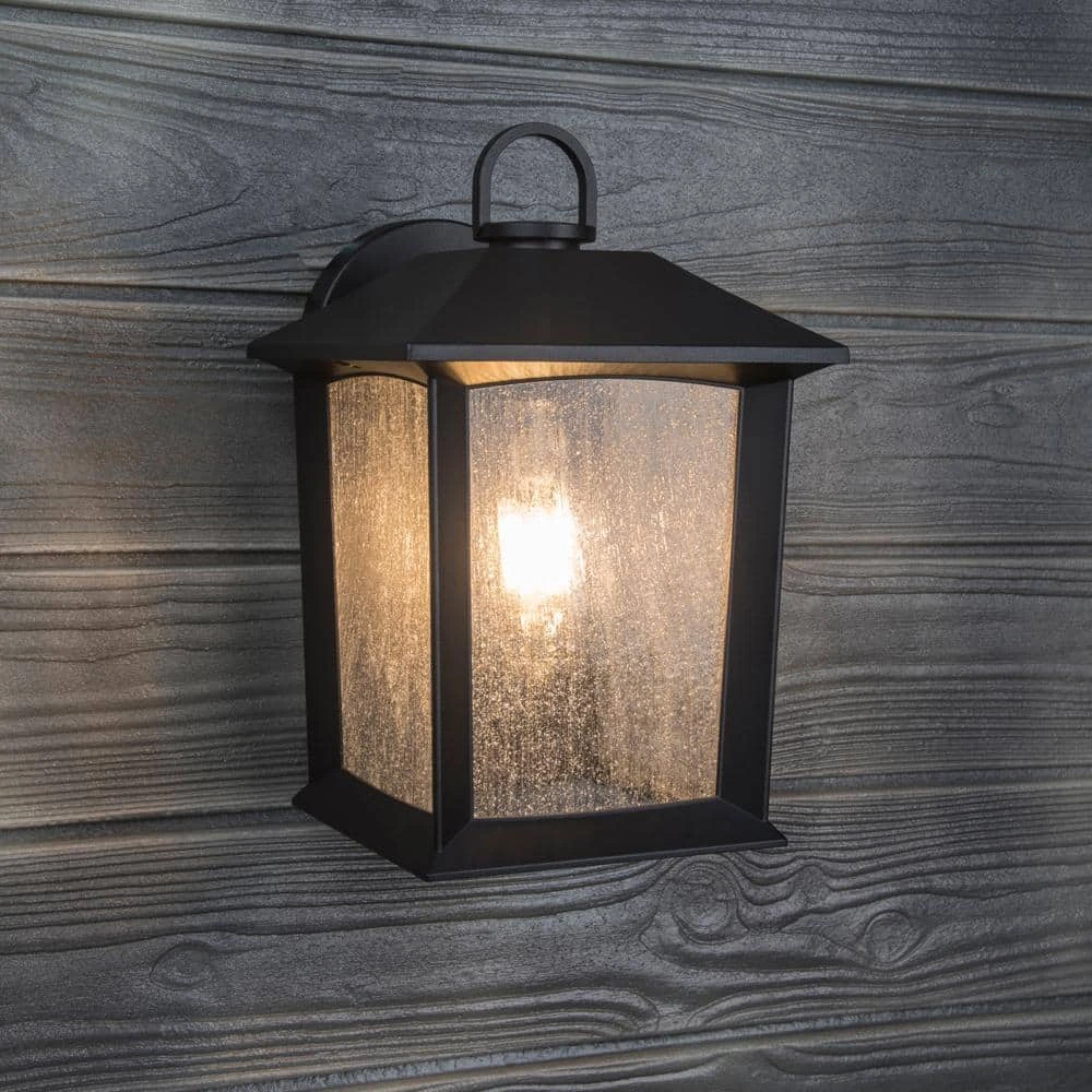The Wall-Mount 1-Light Outdoor Lantern has an attractive aged black finish in a square housing for a design that evokes antique metalwork. The clear, seeded glass is framed by wire strips that give the appearance of windows and help create a warm ambience and add safety for a smaller porch, backyard or side door. Weather-resistant for lasting durability, pair with other pieces for a polished look. It uses one 40-Watt maximum medium-base incandescent bulb (sold separately) to pleasantly illuminate household exteriors.
