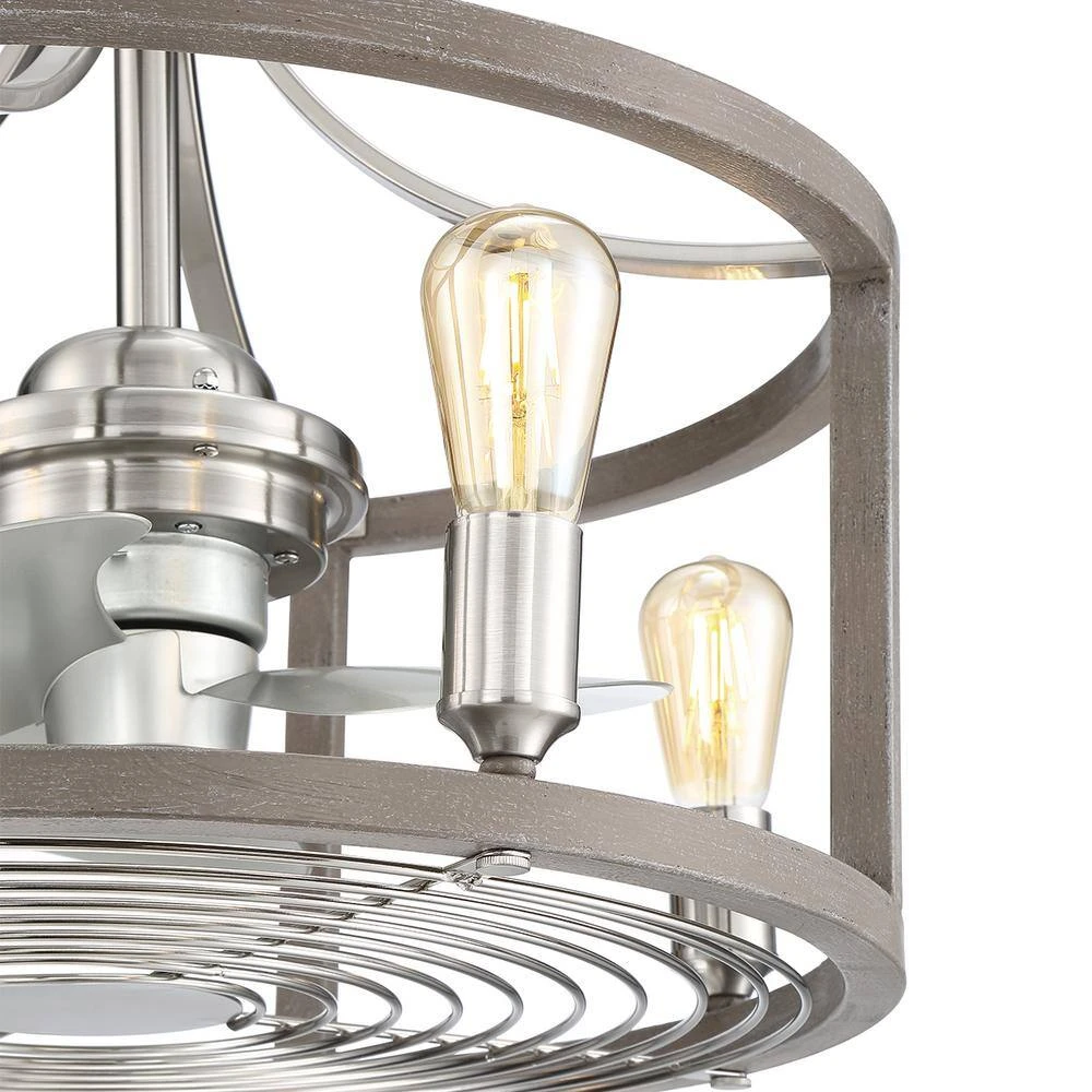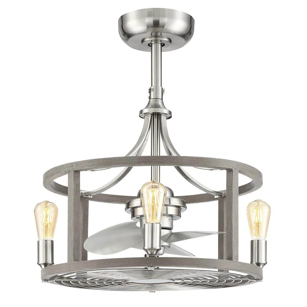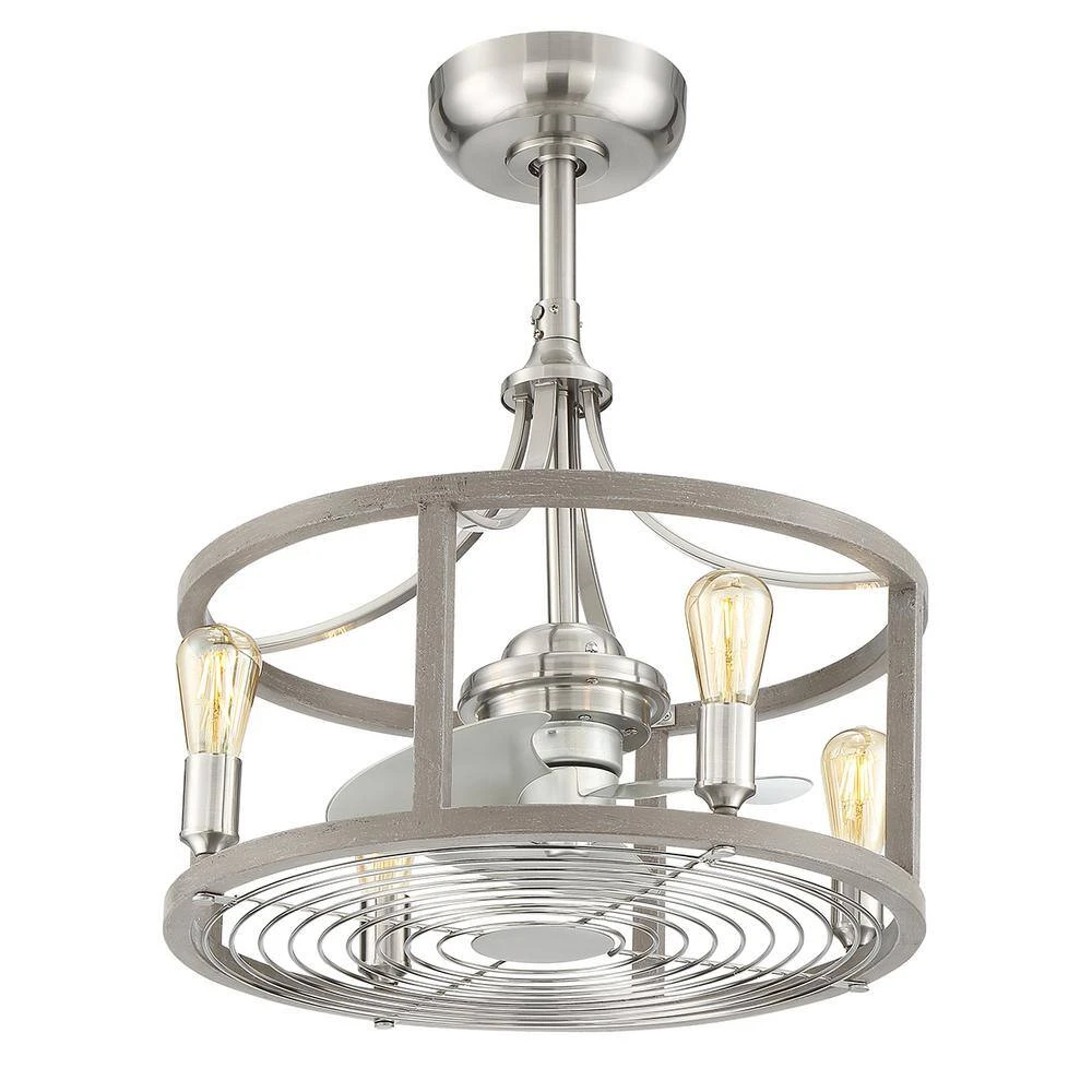 Create a contemporary style for your space with this Bardeau Indoor/Outdoor 21-1/2 in. Brushed Nickel Dual Mount Farmhouse Ceiling Fan with Light Kit and Remote Control. It features a brushed nickel finish with painted weathered gray wood accents. You can easily control the fan speed and light with the remote control.