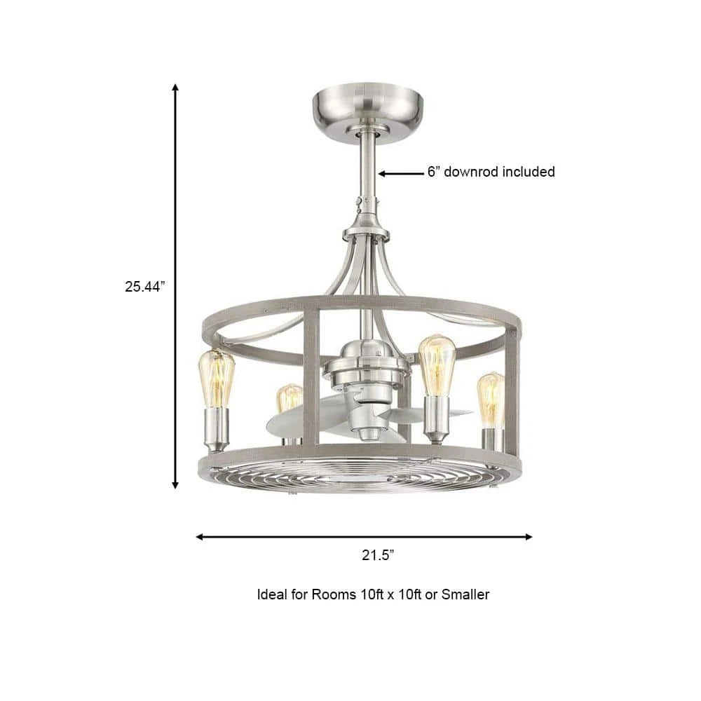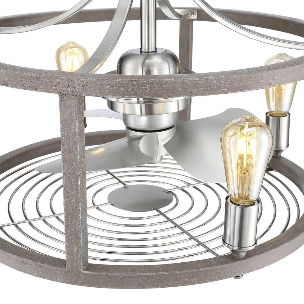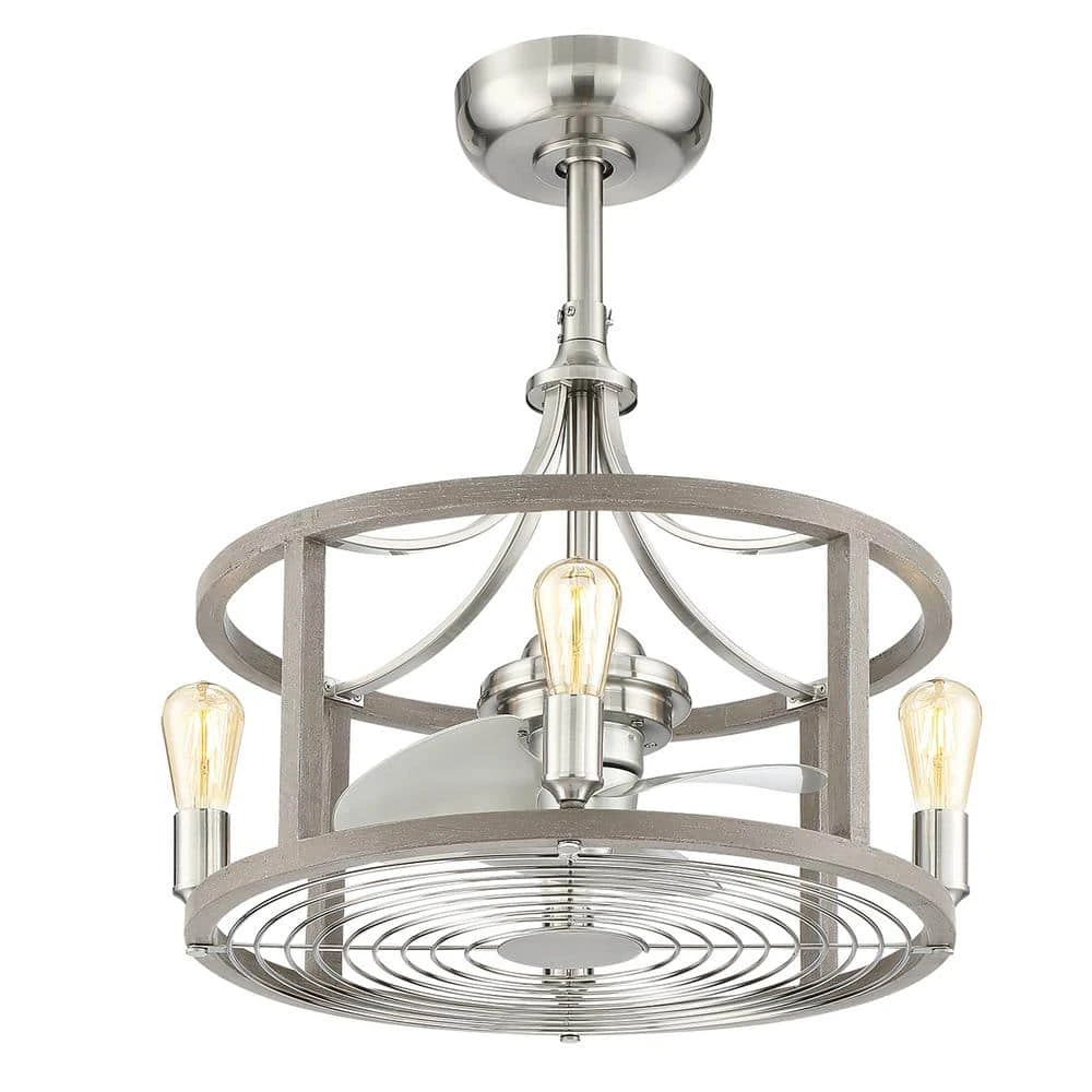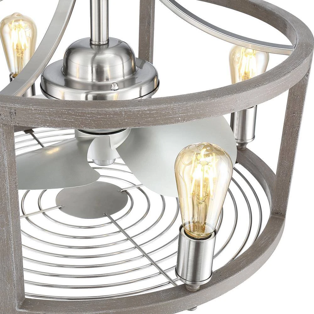 Create a contemporary style for your space with this Bardeau Indoor/Outdoor 21-1/2 in. Brushed Nickel Dual Mount Farmhouse Ceiling Fan with Light Kit and Remote Control. It features a brushed nickel finish with painted weathered gray wood accents. You can easily control the fan speed and light with the remote control.