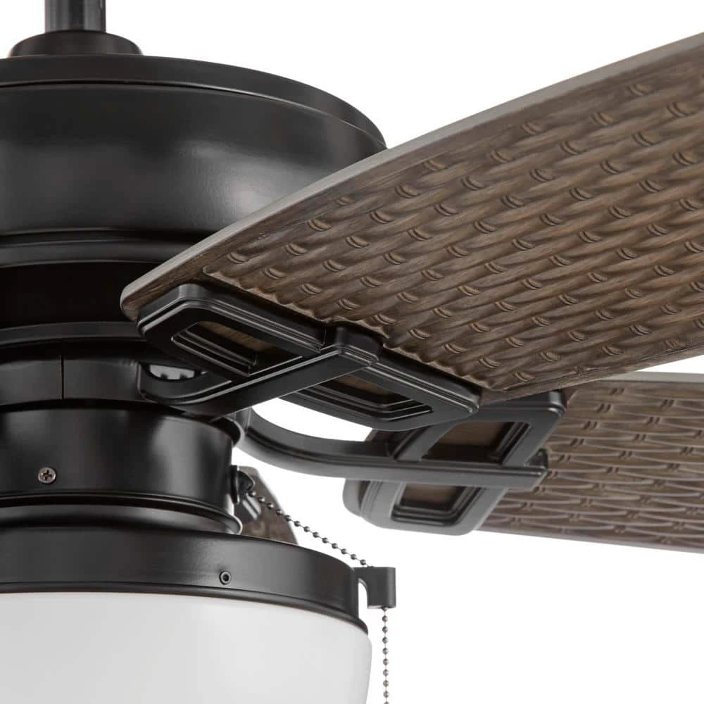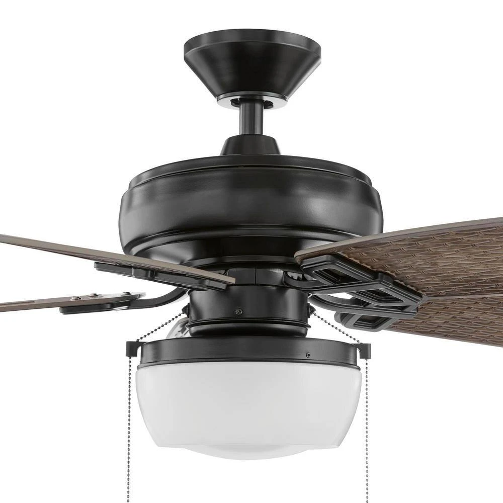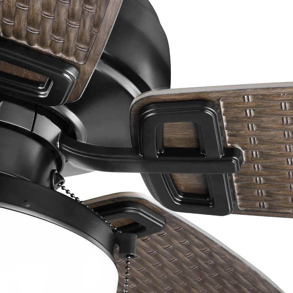 The 52 in. Baywood outdoor ceiling fan from Hampton Bay delivers dependable performance and beautiful design. This fan features a powerful and quiet 3-speed reversible motor for year-round comfort. The Baywood’s striking matte black finish is complemented with 5 Cambridge gray wicker textured blades to blend with outdoor decor trends. The light kit has a frosted shatter resistant plastic shade that mimics frosted glass with the added benefit of not breaking if dropped during cleaning or hit with something in an outdoor setting. The light kit offers a generous amount of light using two 8.5-Watt LED bulbs (included). The fan’s speed and light are easily controlled via the included pull chains.