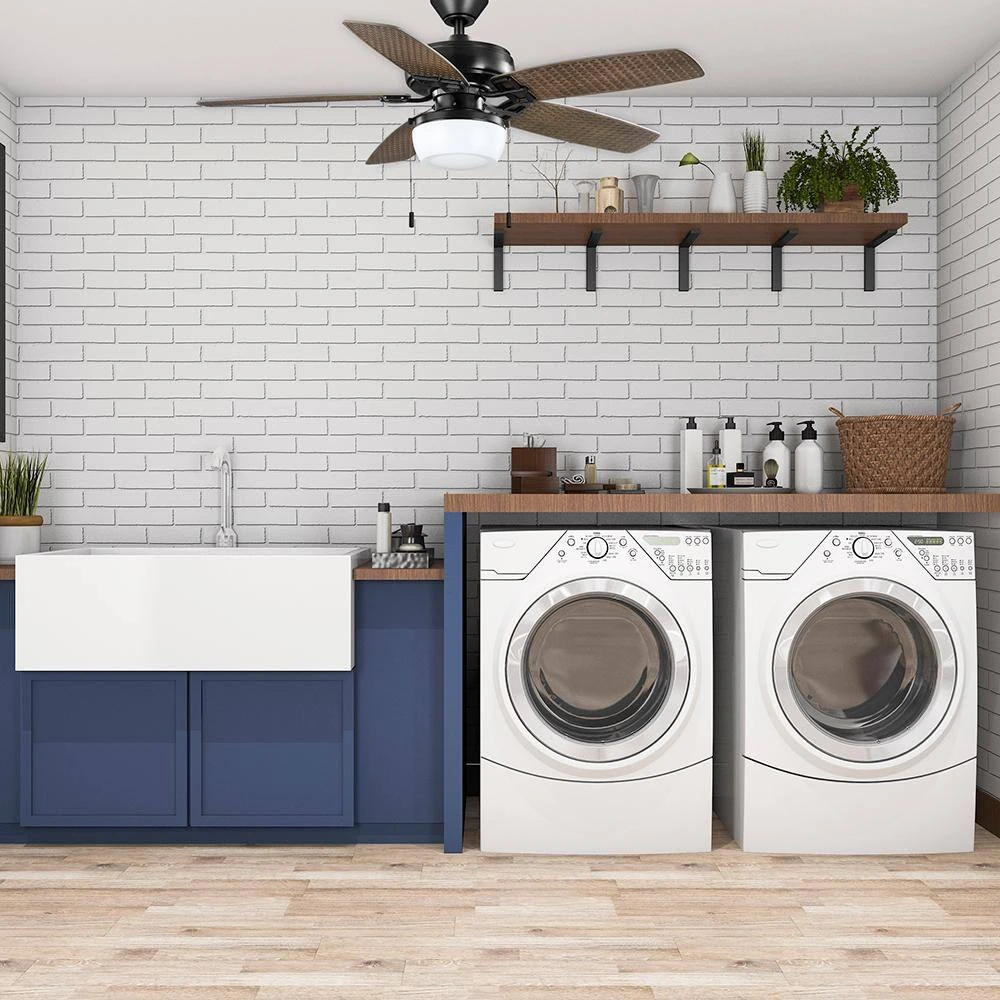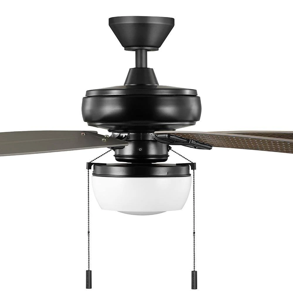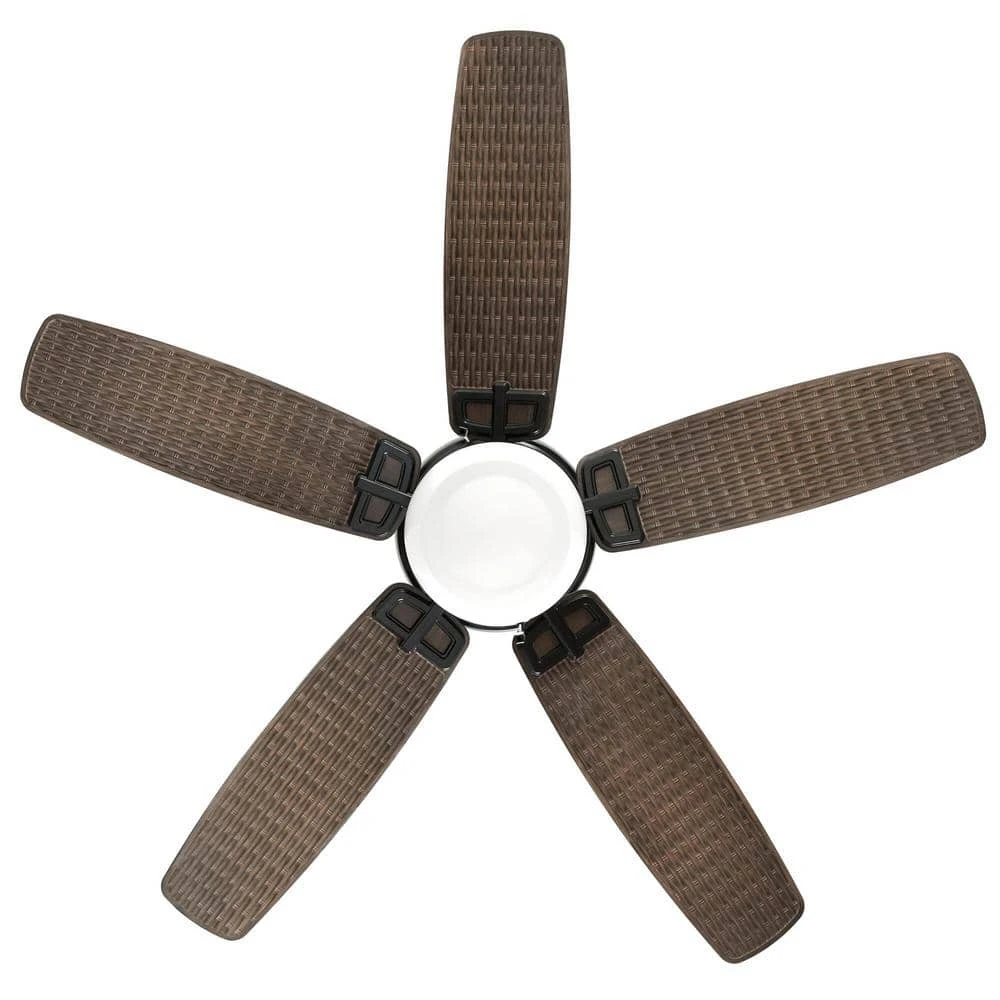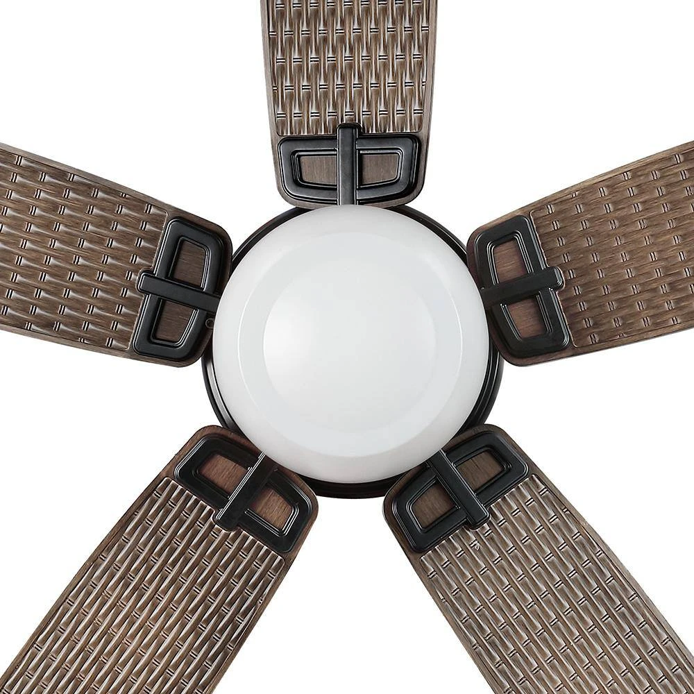 The 52 in. Baywood outdoor ceiling fan from Hampton Bay delivers dependable performance and beautiful design. This fan features a powerful and quiet 3-speed reversible motor for year-round comfort. The Baywood’s striking matte black finish is complemented with 5 Cambridge gray wicker textured blades to blend with outdoor decor trends. The light kit has a frosted shatter resistant plastic shade that mimics frosted glass with the added benefit of not breaking if dropped during cleaning or hit with something in an outdoor setting. The light kit offers a generous amount of light using two 8.5-Watt LED bulbs (included). The fan’s speed and light are easily controlled via the included pull chains.