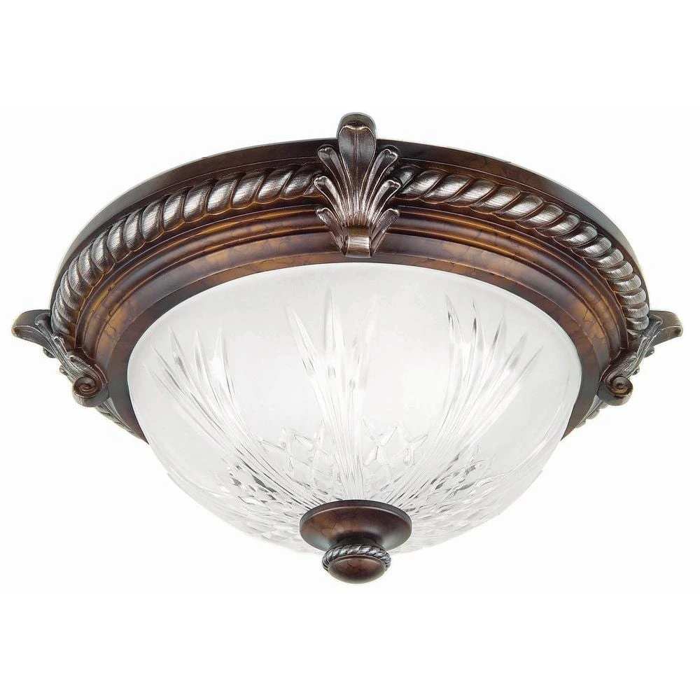 Rich and elegantly styled, the Bercello Estates 2-Light Volterra Bronze Flushmount from Hampton Bay will complement a variety of home styles and decor. A simple way to upgrade your bedroom, hallway or den, this fixture features a dark volterra bronze finish that is beautifully contrasted with a clear and frosted glass shade with striking carved details. Easy to install, pair with other pieces from the Bercello Estates Collection for a custom and polished look you will cherish and friends will admire.