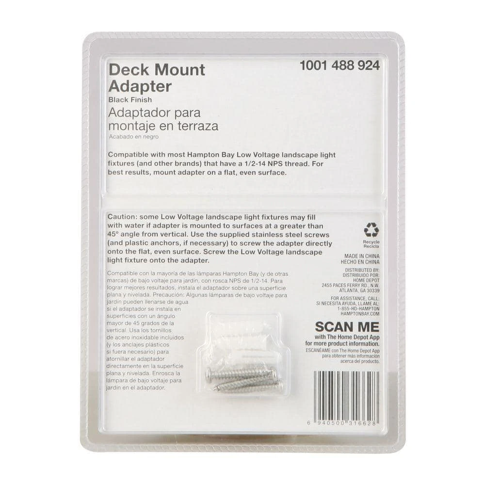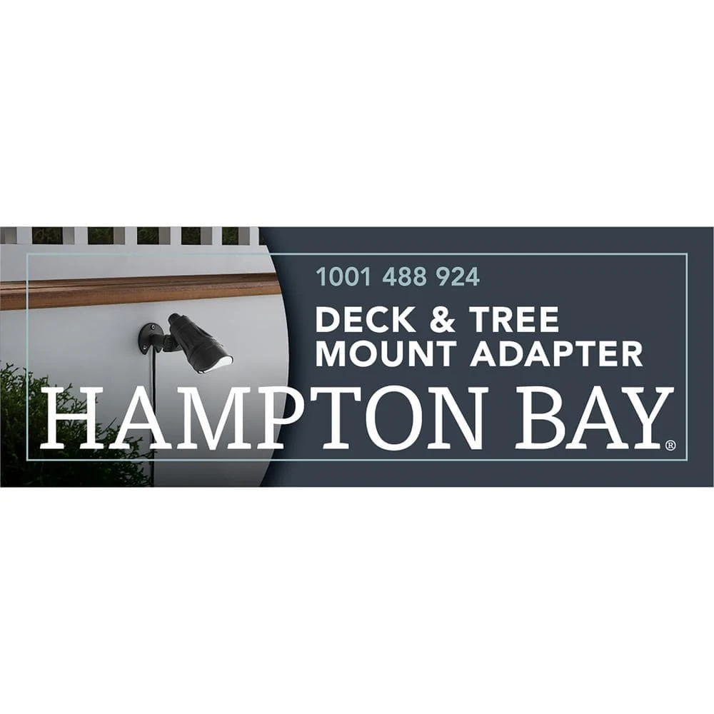 The Hampton Bay Black Deck and Tree Mount Adapter allows Hampton Bay landscape lighting to be conveniently mounted on a deck or tree. Great for showcasing trees, its weather-resistant design is crafted from cast aluminum with a protective powder-coated finish for extra durability. Designed for easy setup, the adapter includes three stainless steel screws for mounting and can be used in place of the stake supplied with your light fixture.