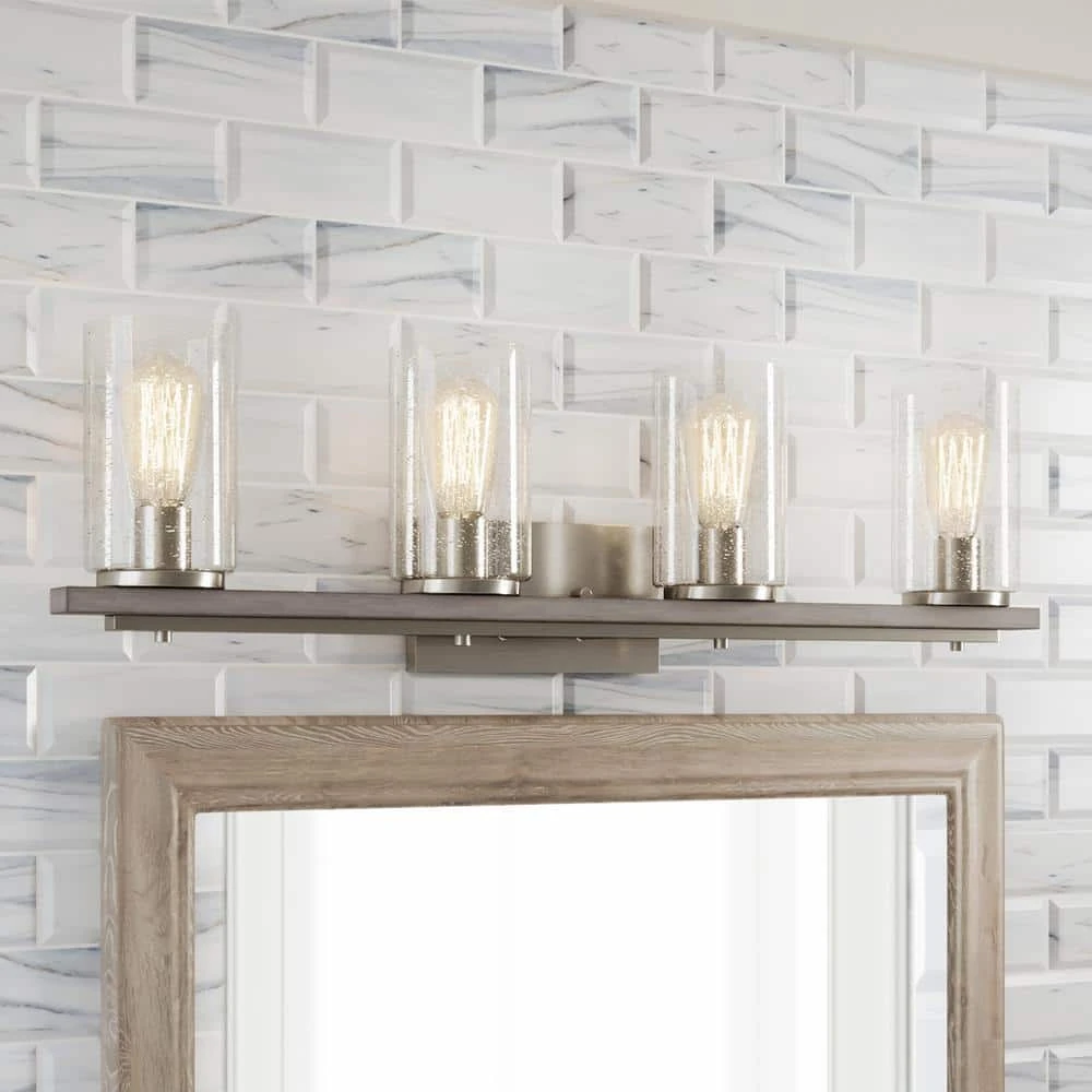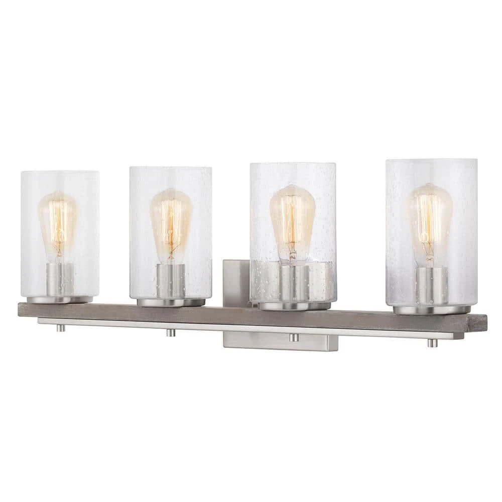 Featuring handsome and sophisticated details, the Boswell Quarter collection is ideal for a variety of design styles – from Transitional to Modern Farmhouse. Clear seeded glass shades are paired with a Brushed Nickel finish and weathered gray wood accents. Form follows function in this four-light bath and vanity design, which can be mounted facing up or down for added customization.