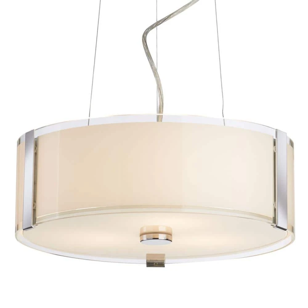 The Bourland Collection features contemporary style interior lighting with sleek polished chrome finishes paired with white opal and clear glass. The Bourland pendant houses three 60-watt light bulbs, providing ample illumination for a variety of applications. A white opal drum shade ensures the light is evenly distributed from the three bulbs while the clear glass outer enclosure adds style and interest to the piece. The polished chrome hardware reflects the light to add even more brilliance to your space. This Bourland hanging fixture includes a matching ceiling plate and three wires for an adjustable height. Mount this contemporary pendant in kitchens, dining room, and more.