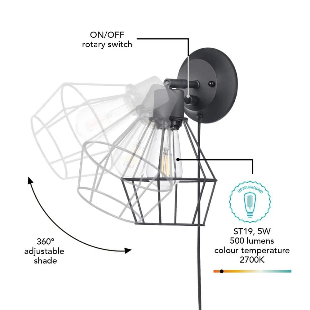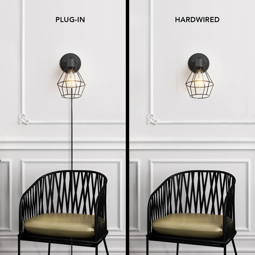 With its plug-in or hardwire collection, Hampton Bay created a wall sconce for all your lighting needs. This caged shade wall light offers dark academia design that complements all interior decor. This adjustable wall fixture can be pointed up or down, allowing you to customize your lighting ambiance and mood. Ideal for use in kitchens, restaurants, bars, and dining rooms – the exposed bulb delivers a cozy, vintage look.