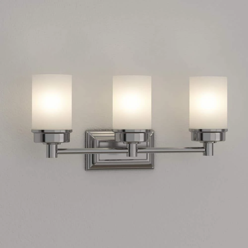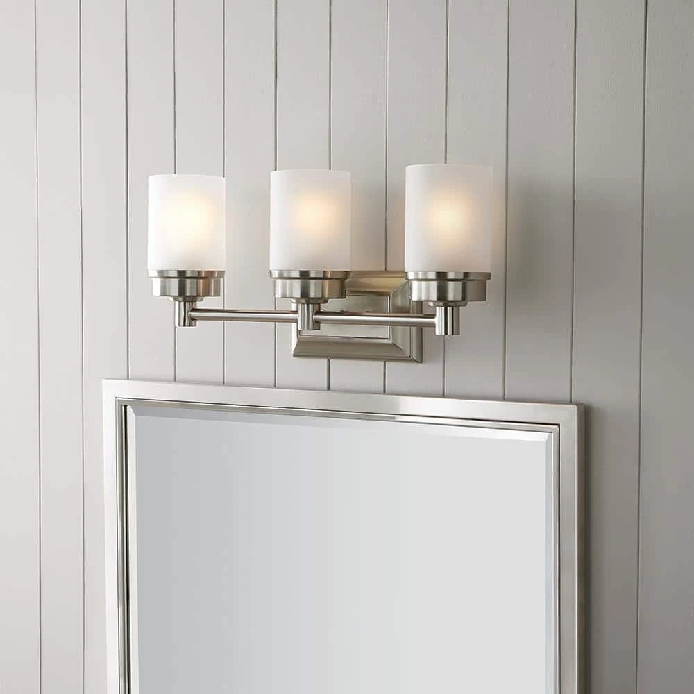 The Hampton Bay Cade Collection exhibits transitional style vanity lighting that will upgrade your bathroom or powder room with elegant style. The Hampton Bay Cade 20.25 inch bathroom vanity light in brushed nickel uses three 60-watt bulbs, each of which is shaded by white frosted glass. The white glass is complimented by a classic, brushed nickel finish that will easily coordinate with existing bathroom styles. The cylindrical shaped shades are open at the bottom, allowing access to change the bulbs. The shades are held in place by a straight arm connected to a rectangular backplate which features matching line detail present throughout the piece. This vanity light bar can be mounted with the shades facing upwards or downwards for a customizable look.