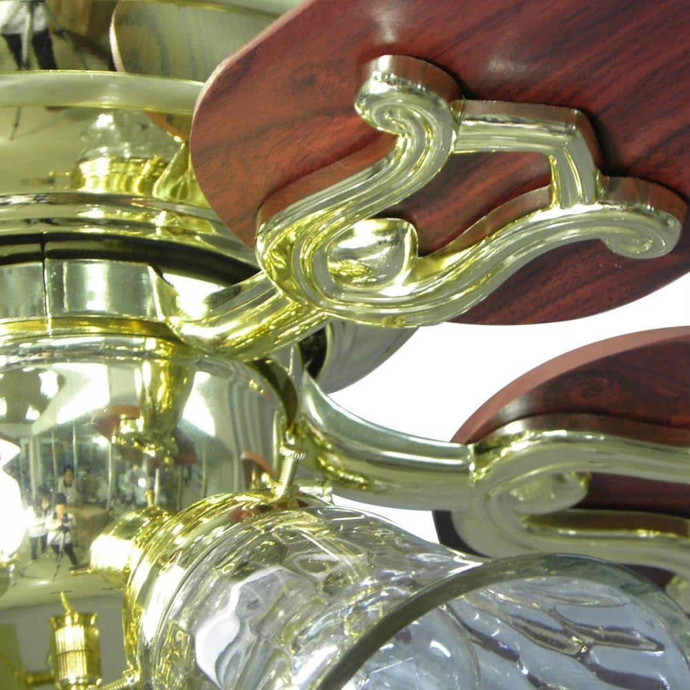 Dress up your space with this Carriage House 52 in. Indoor LED Polished Brass Ceiling Fan with Light Kit, Reversible Motor and Reversible Blades. You can use four 9.5-watt LED bulbs with this fan. They are included with the light kit. It also features a triple-capacitor speed control for quiet operation, five reversible rosewood/medium oak wood-tone finish blades and a premium motor for better performance and airflow.