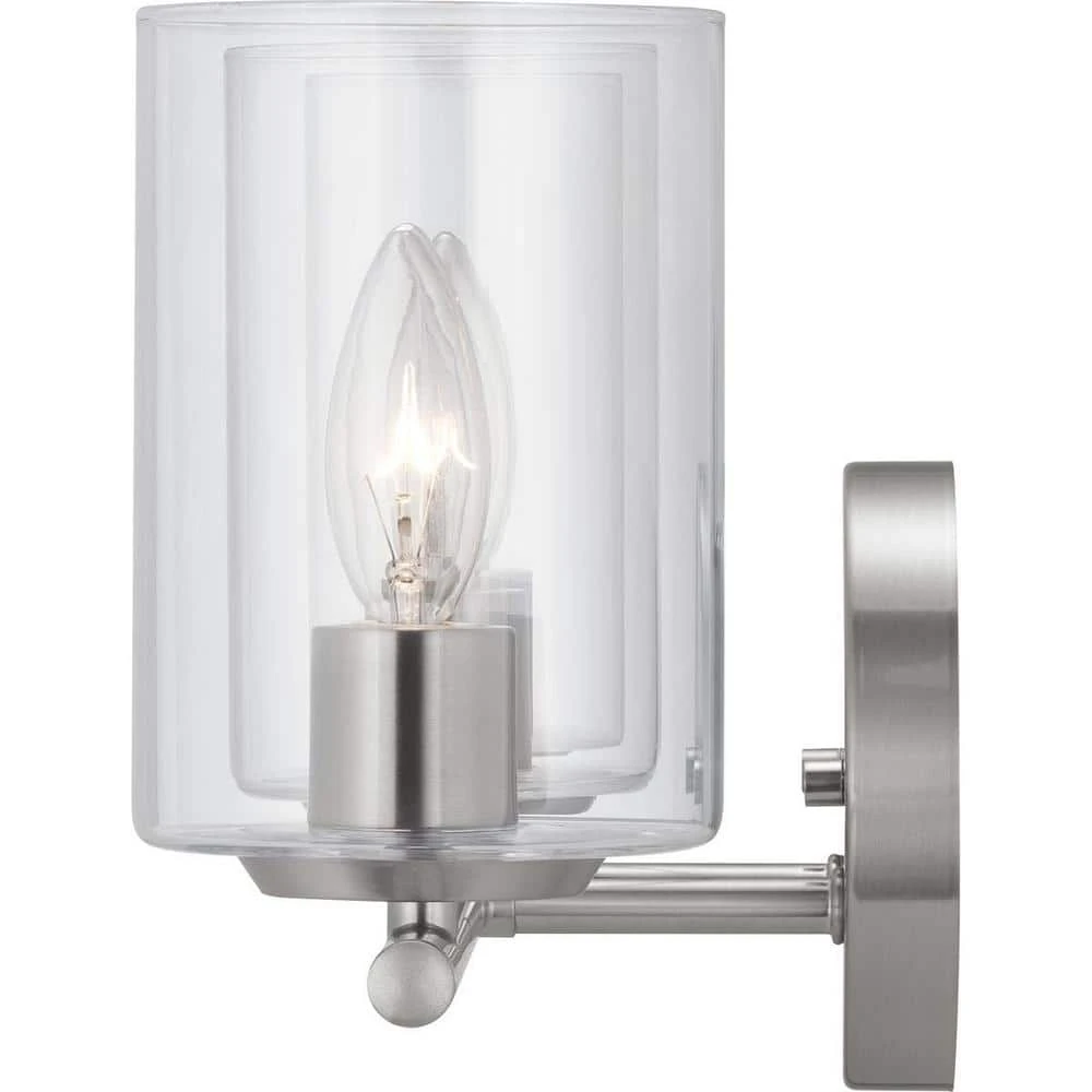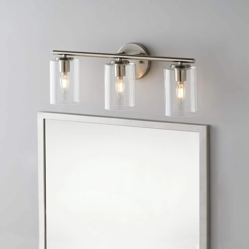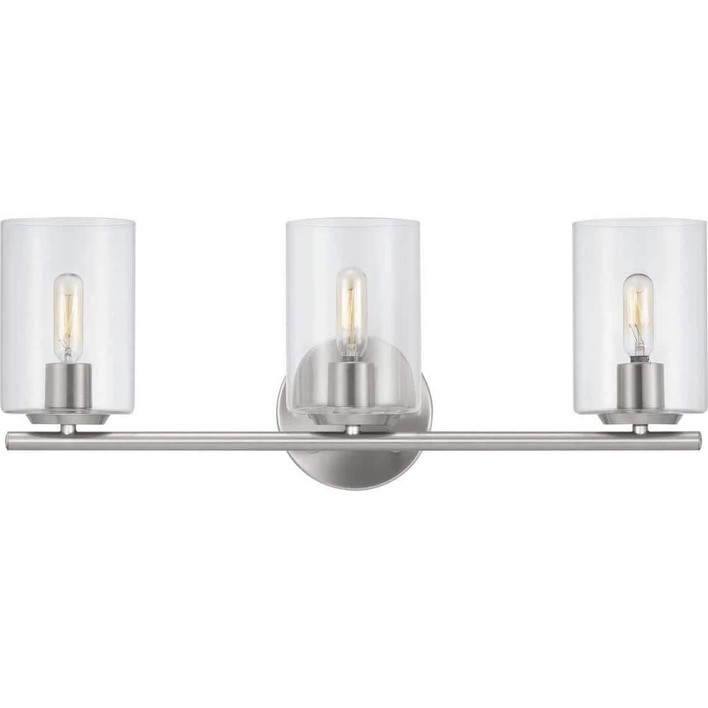 Instill in your bathroom the rejuvenating vibes of a world class spa with the Carabella 3-Light Brushed Nickel Bathroom Vanity Light. Stunning clear glass shades perch on simple light bases in a linear fashion. A single smooth bar holds the light bases in place and affixes to a sleek round backplate. The frame is coated in a beautiful brushed nickel finish that fosters a dream bathroom look.