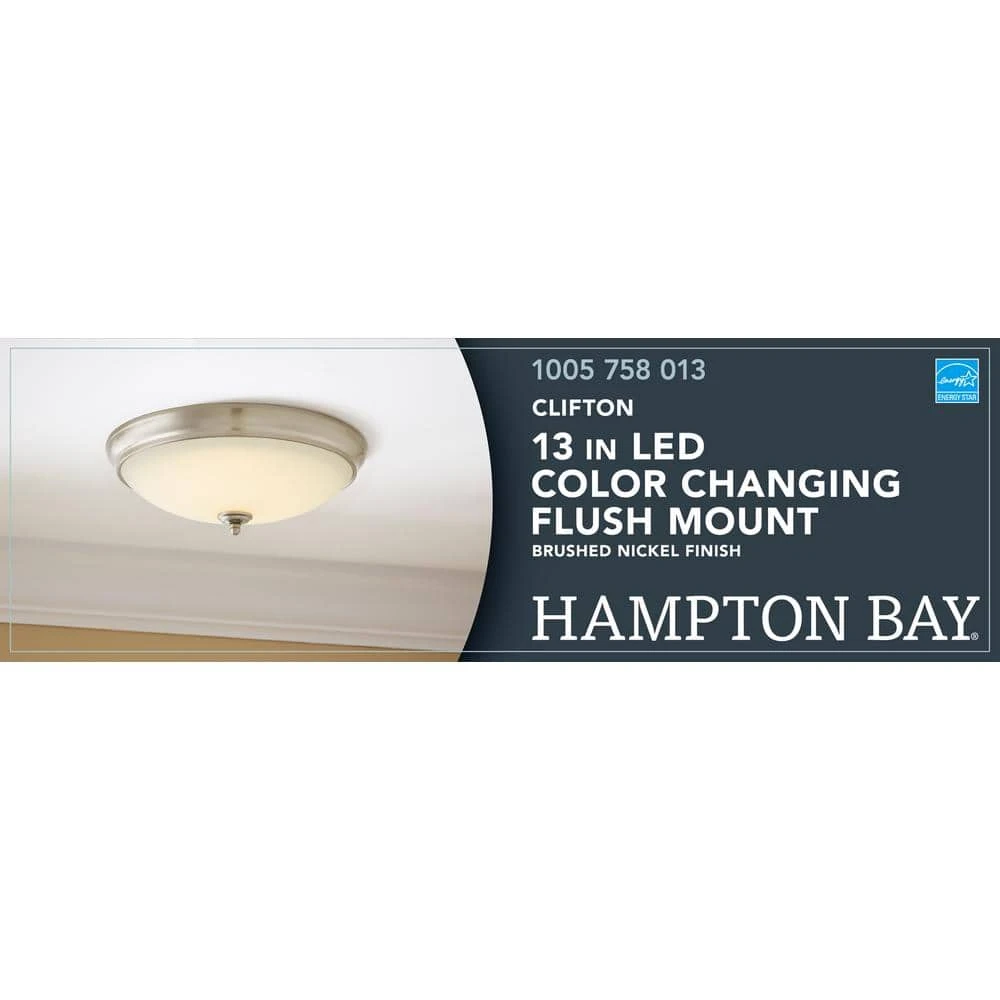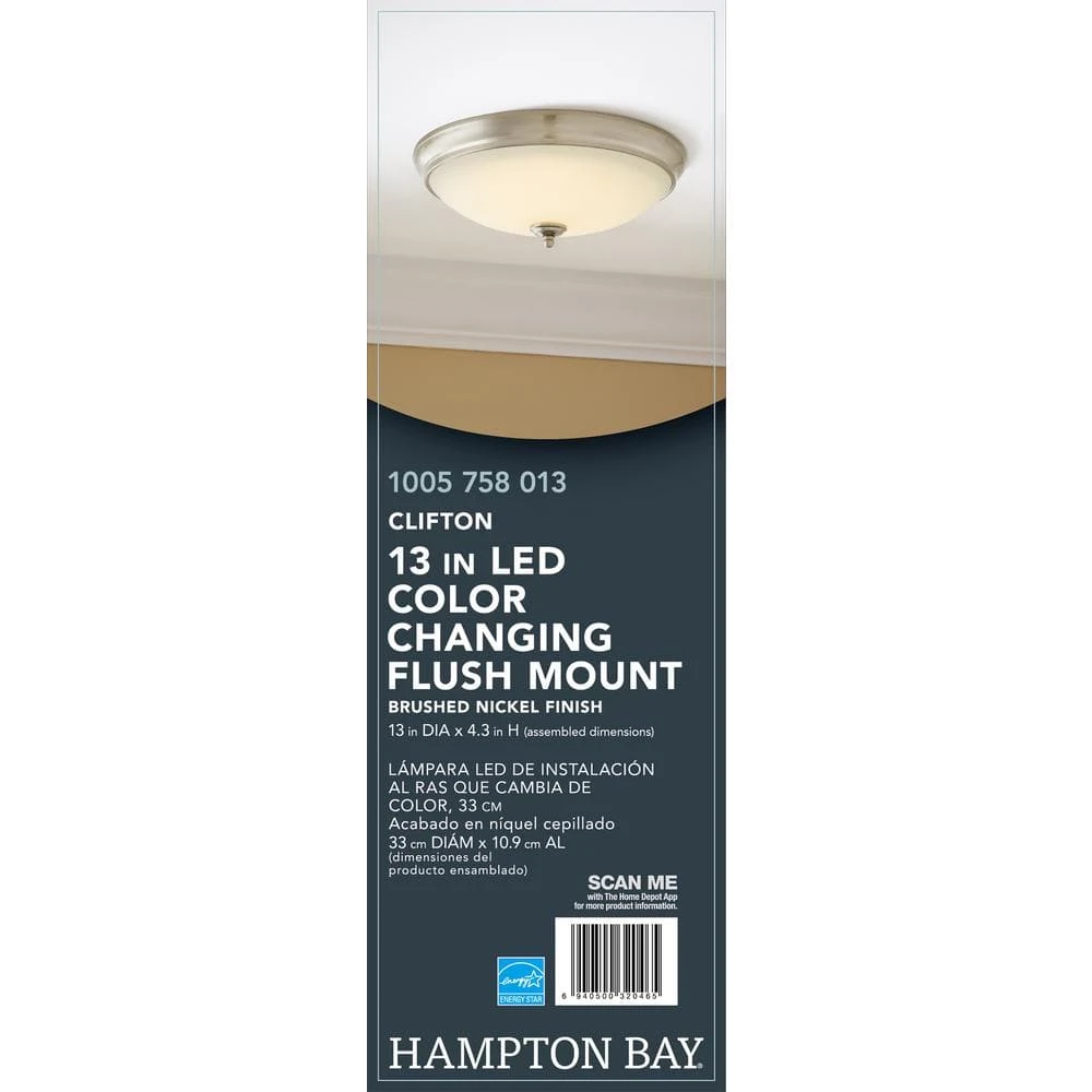 The technology of this 13 in. 23-Watt Brushed Nickel Ceiling Flushmount has a 90 CRI high color rendering that creates a perfect illumination and makes this fixture completely glare free providing more natural light for your home or office. The long-lasting LED technology provides light output equivalent to 180-Watt of traditional incandescent lighting, while using less than 20% of the energy for year round savings. If features a selectable color temperature feature which allows you to choose your preferred white light color: soft 2700K, warm 3000K, bright 3500K, cool 4000K, or daylight 5000K. Enjoy a 5-year warranty and a rated life of 45-years or 50,000-hours of continuous use. The ENERGY STAR certified light source is maintenance free with no bulbs to change. You will enjoy a light with a sleek, low profile and soft industrial design and it’s even easy to install with a provided bracket and only requires 1-person to install.