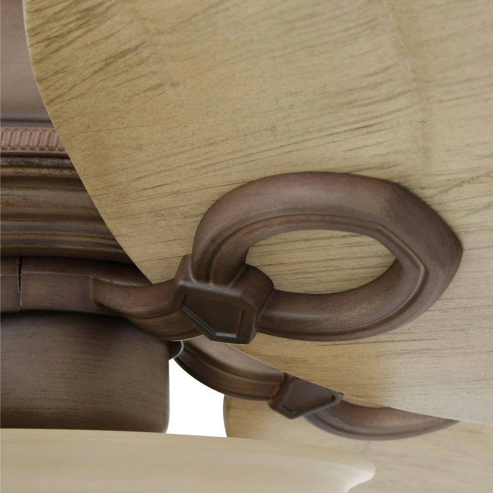 - 5-hand carved, all-weather wood blades in reclaimed oak finish