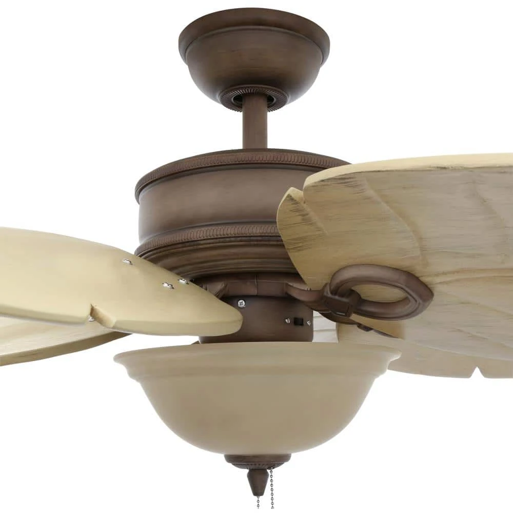 Add a touch of the tropics to your decor with the Hampton Bay 56 in. Costa Mesa weathered zinc ceiling fan. This fan is damp rated for use outdoors in covered porches. The beautiful styling of this fan allows it to be installed indoors as well, complimenting many decorating trends. The fan comes complete with hand carved, all-weather wood blades in reclaimed oak finish, a sandstone glass bowl light kit and (2) 9.5-Watt LED bulbs. The patented Accu-Arm Technology allows for accurate and easy installation with quiet, wobble-free operation.