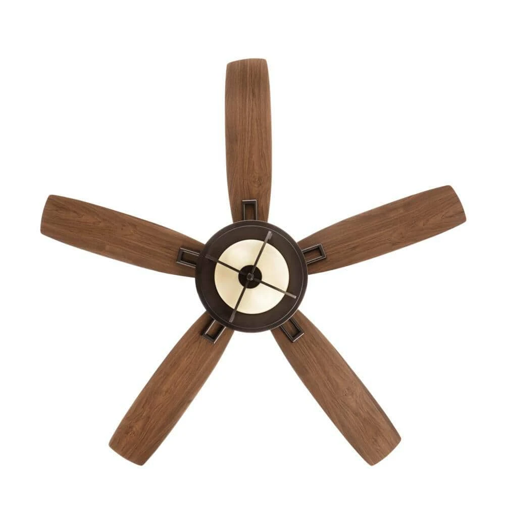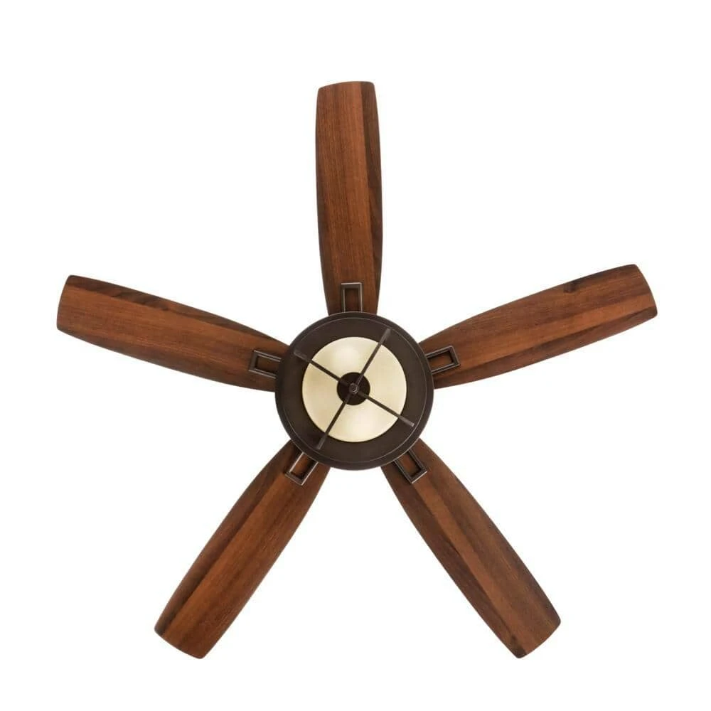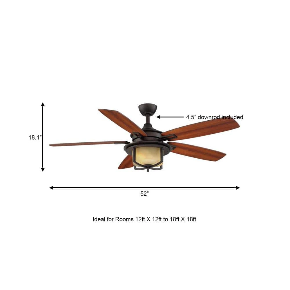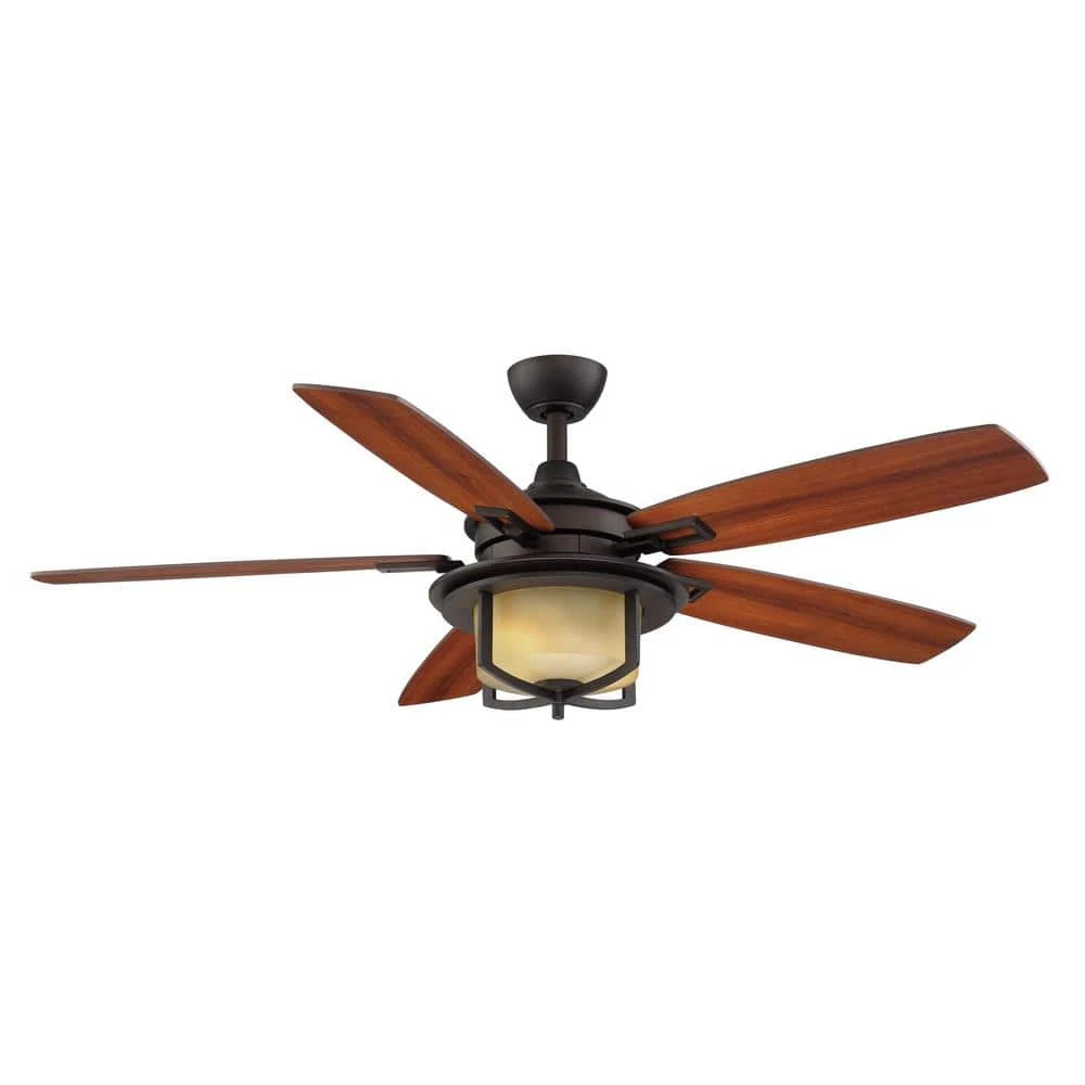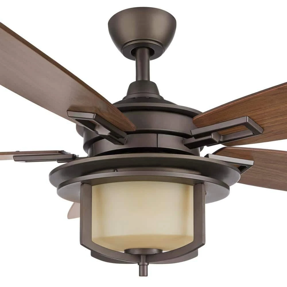 The Hampton Bay Devereaux II Oil Rubbed Bronze Ceiling Fan has five reversible Medium Maple/Walnut blades and a transitional, craftsman design. The integrated light kit comes with a light amber glass which is engaged to complete its overall look. The powerful 172 mm x 17 mm motor is reversible for the Winter months. Also included is a handheld remote with independent light and speed control. Uses two 9.5-Watt LED bulbs (included).