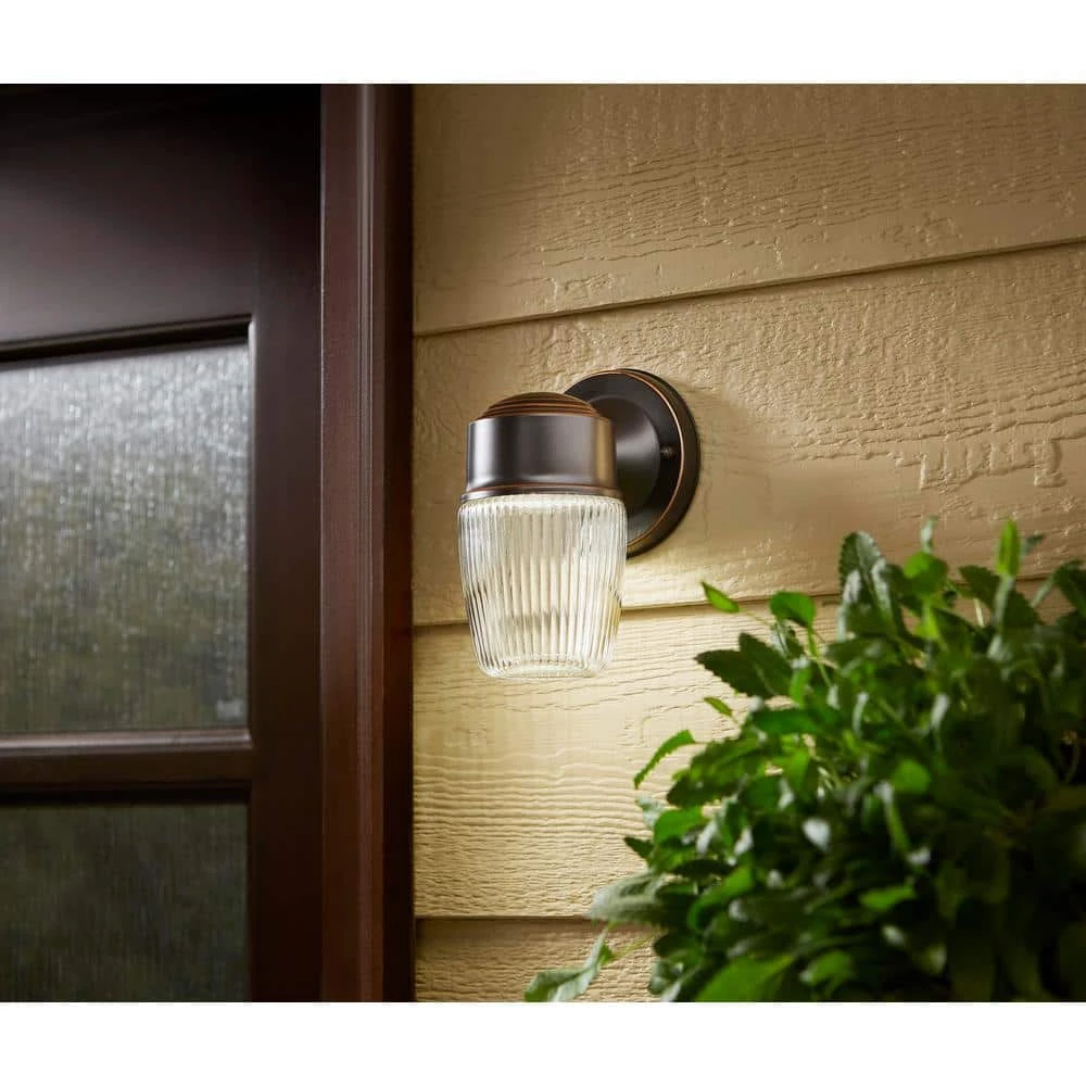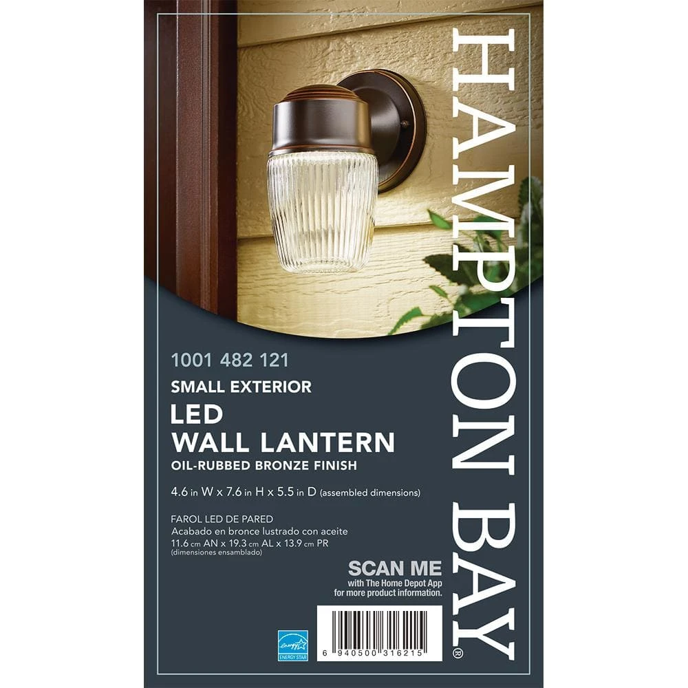 This Hampton Bay Outdoor Wall Lantern has a classic shape in a contemporary housing. This timeless wall jelly jar fixture is finished in oil rubbed bronze. It features a Dusk-to-Dawn photocell that illuminates the LED light at dusk and turns it off at dawn.