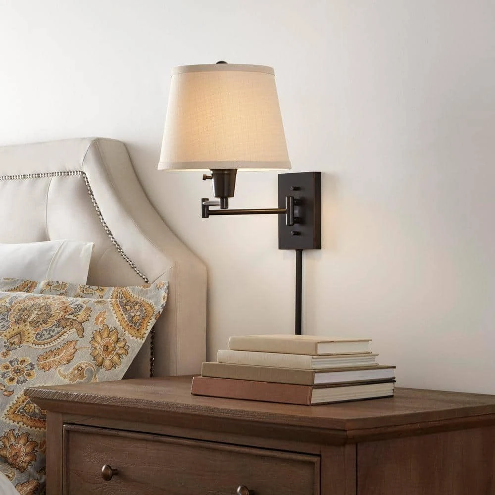 1 Light oil rubbed bronze swing arm wall sconce with cord and plug adds a warm and functional light option for any room or space. Designed with rich oil rubbed bronze finish and fabric cream shade to match any decor style. Adds focal point to any space.