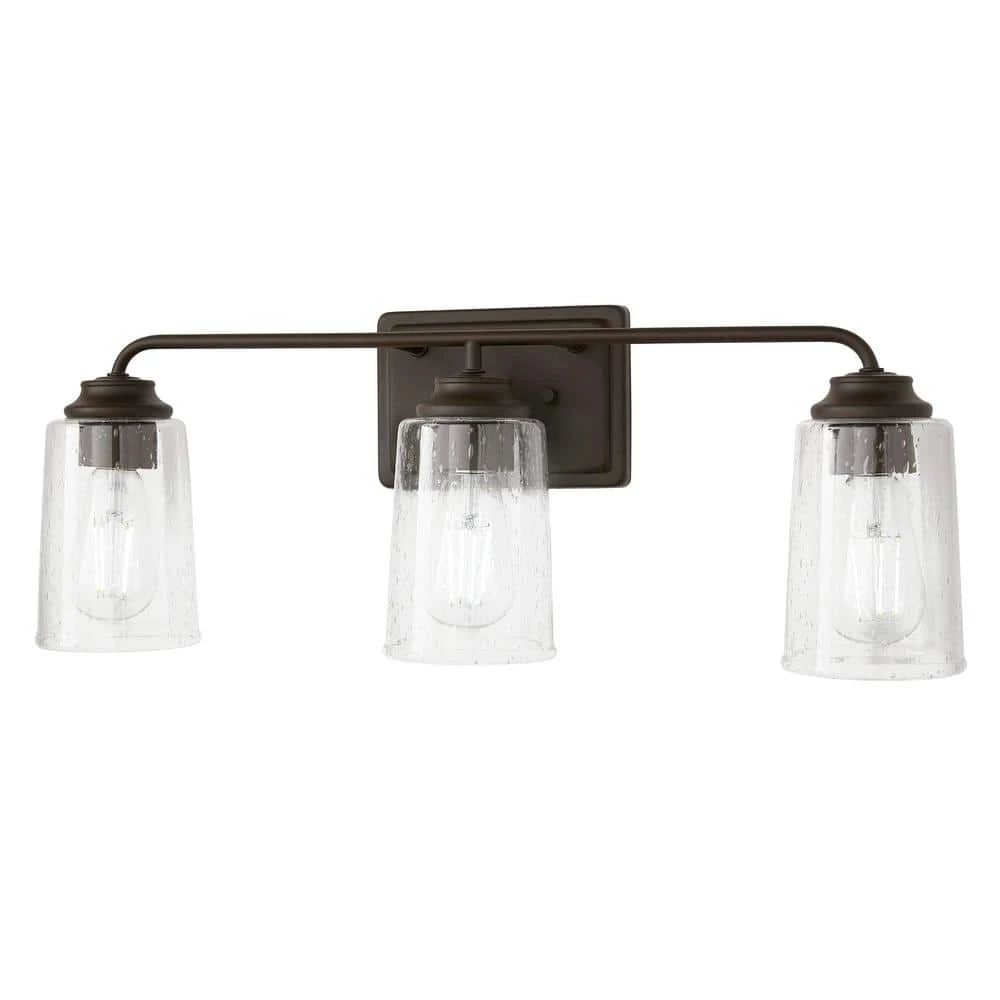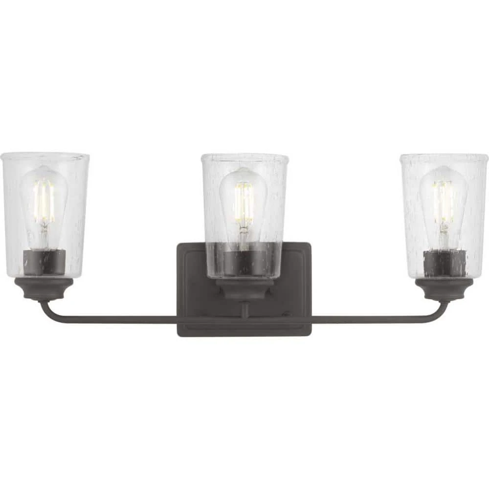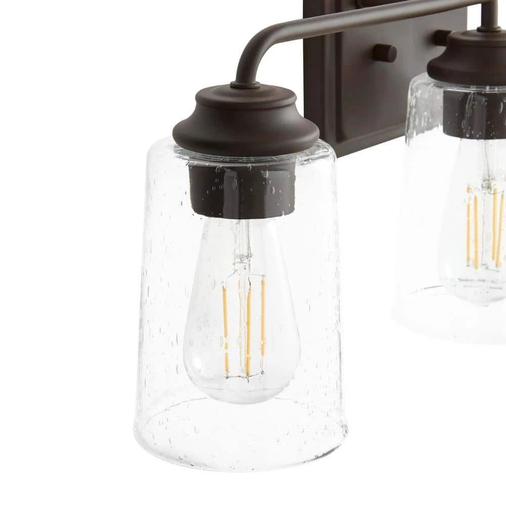 The Evangeline 3-Light Bath Vanity Light will effortlessly bring your space together. A rectangular backplate and smooth horizontal bar are coated in a handsome modern bronze finish that accentuates the light fixture’s farmhouse aesthetic. Clear seeded glass shades add an extra-touch of personality to top off the design. Bulbs not included.