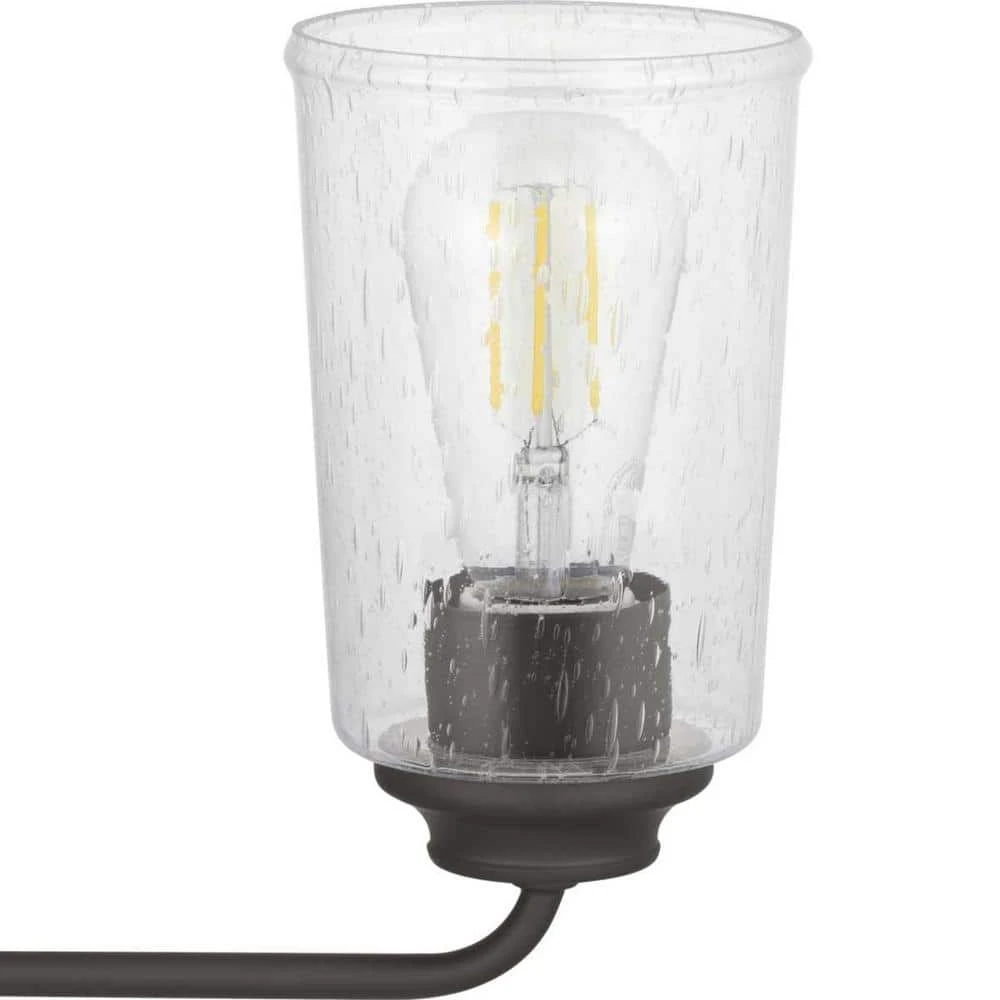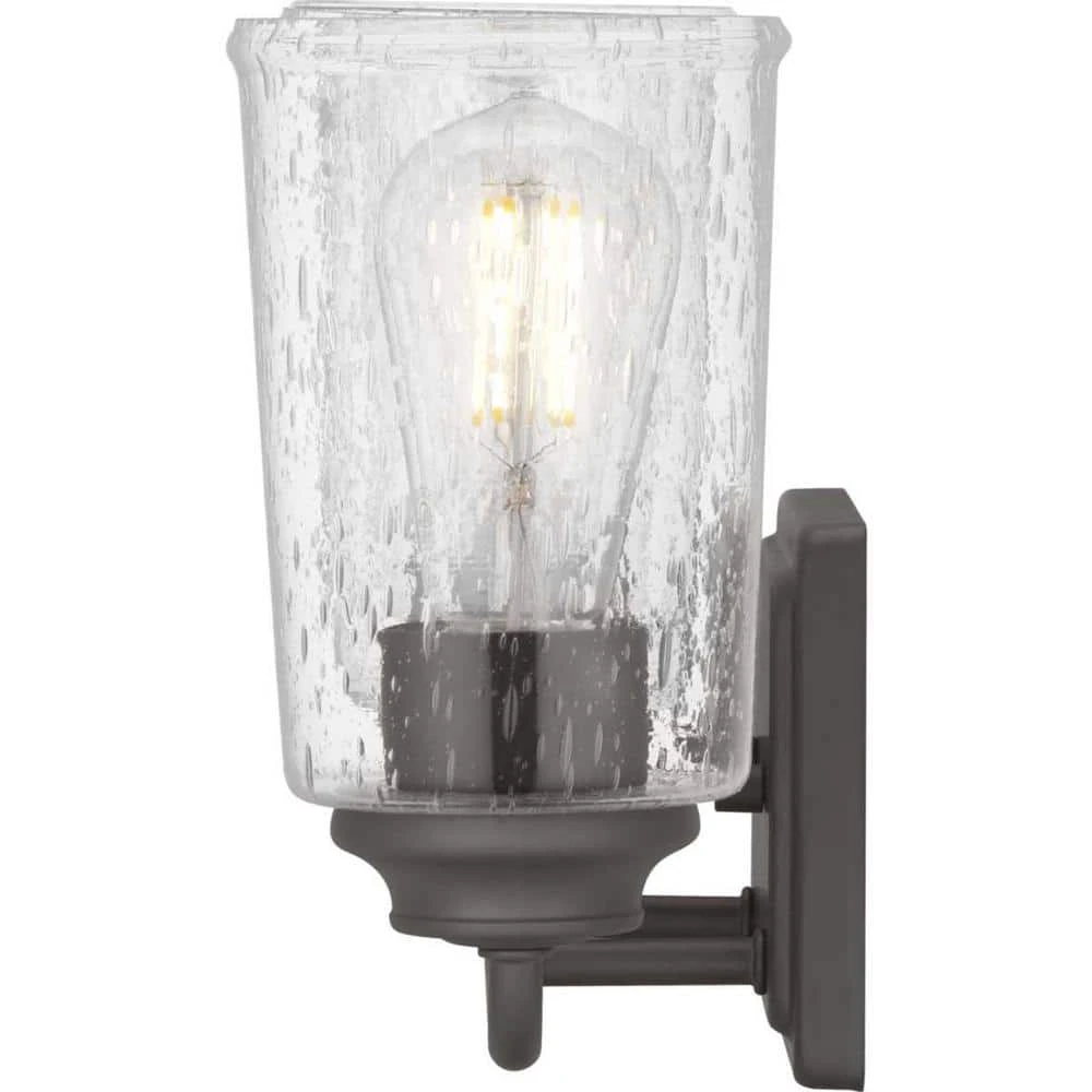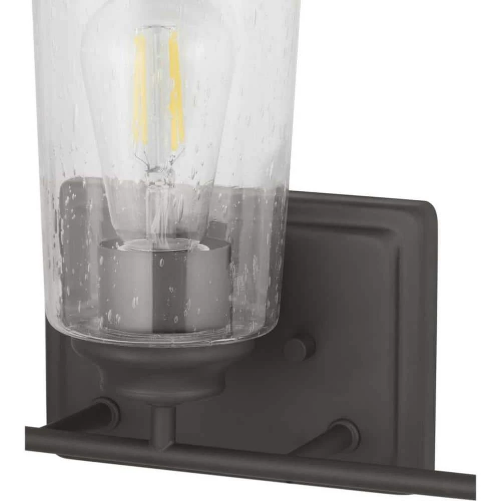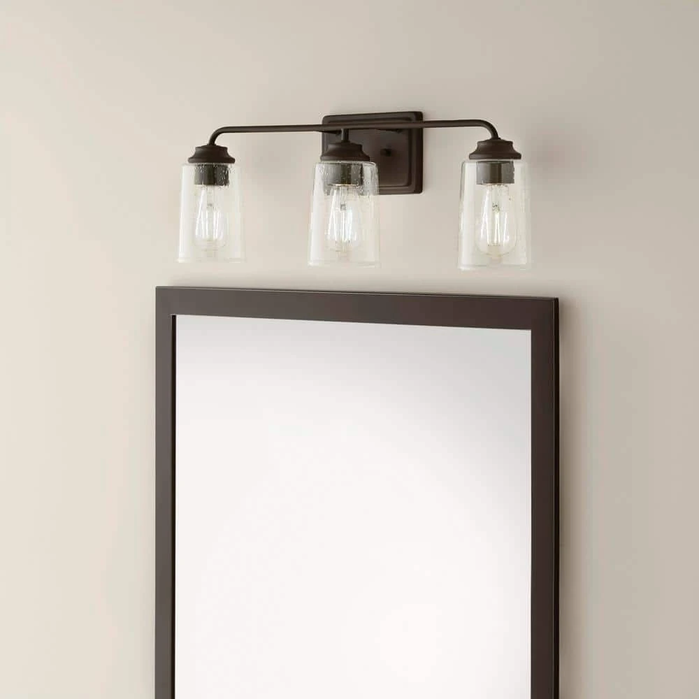 The Evangeline 3-Light Bath Vanity Light will effortlessly bring your space together. A rectangular backplate and smooth horizontal bar are coated in a handsome modern bronze finish that accentuates the light fixture’s farmhouse aesthetic. Clear seeded glass shades add an extra-touch of personality to top off the design. Bulbs not included.