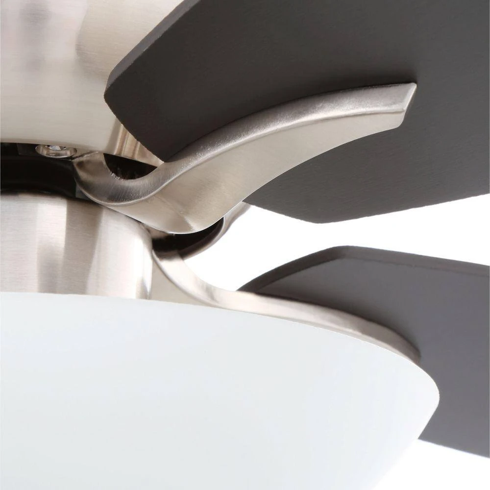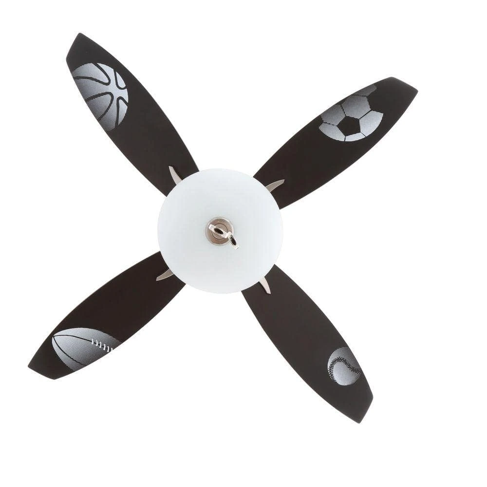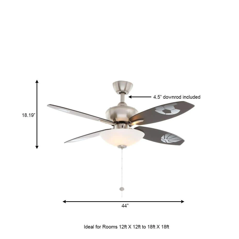 Great for both the young and young at heart, the Hampton Bay Everstar Brushed Nickel Ceiling Fan features reversible blades whimsically adorned with sport prints to wonderfully accent your space. The Everstar has 4 reversible black/silver blades with sport prints blades, a frosted glass bowl-style lighting kit, and control options for 3 variable speeds and a motor reverse. Uses three 40-Watt candelabra bulbs (included).