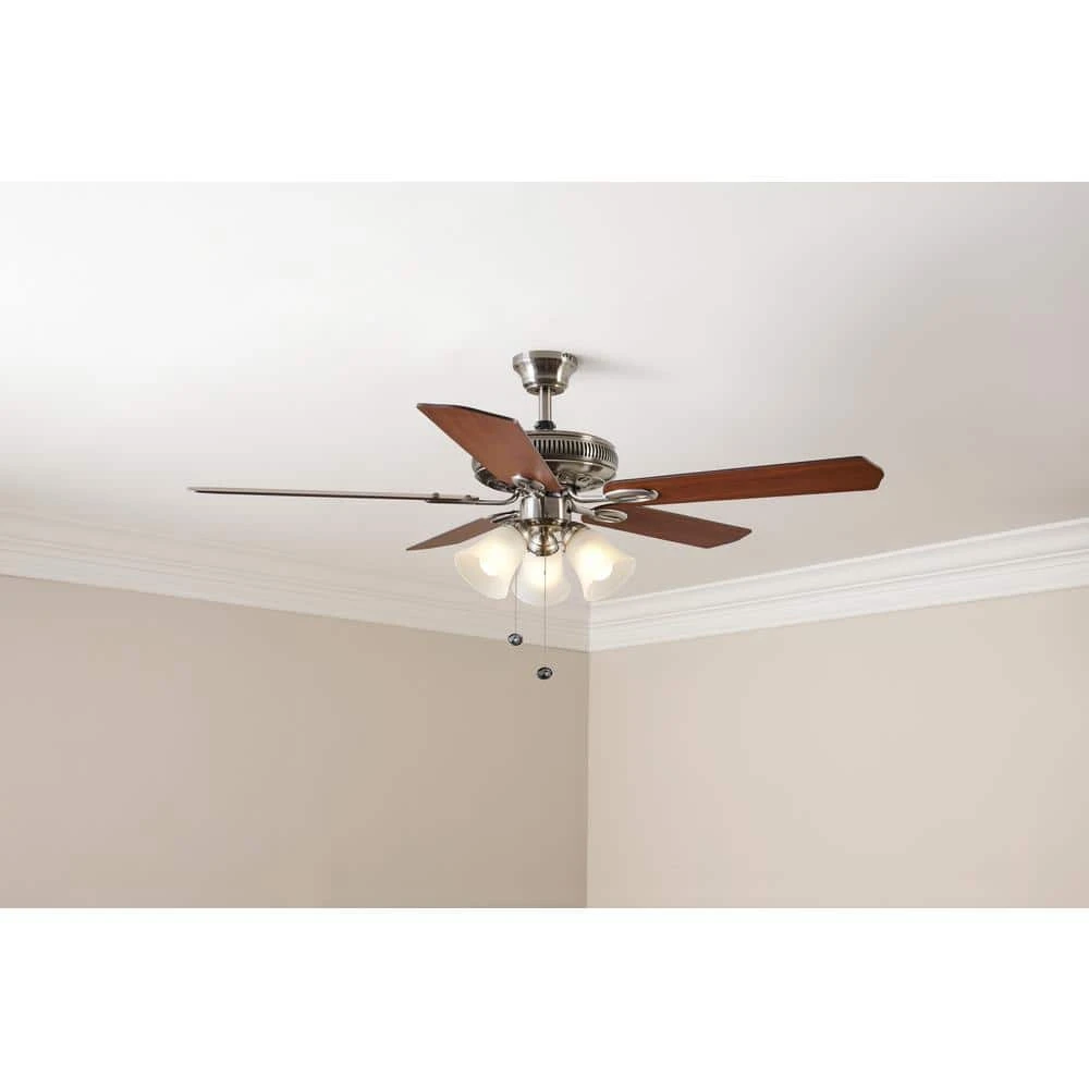 The Hampton Bay Glendale Brushed Nickel Ceiling Fan adds a touch of transitional style to your home with its three-light kit of frosted glass and brushed-nickel finish. The 5 blades are reversible in mahogany or maple finishes to make it easy to change your decor without needing to replace the entire fan. The motor features 3-speeds of operation with a reversible control, while the bracket set system offers speedy installation and quiet operation with little wobbling. Uses three 9.5-Watt LED bulbs (included).