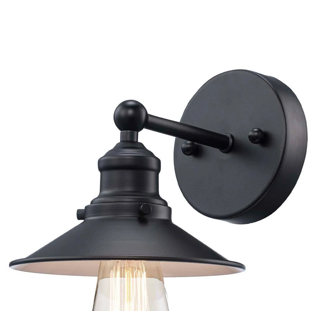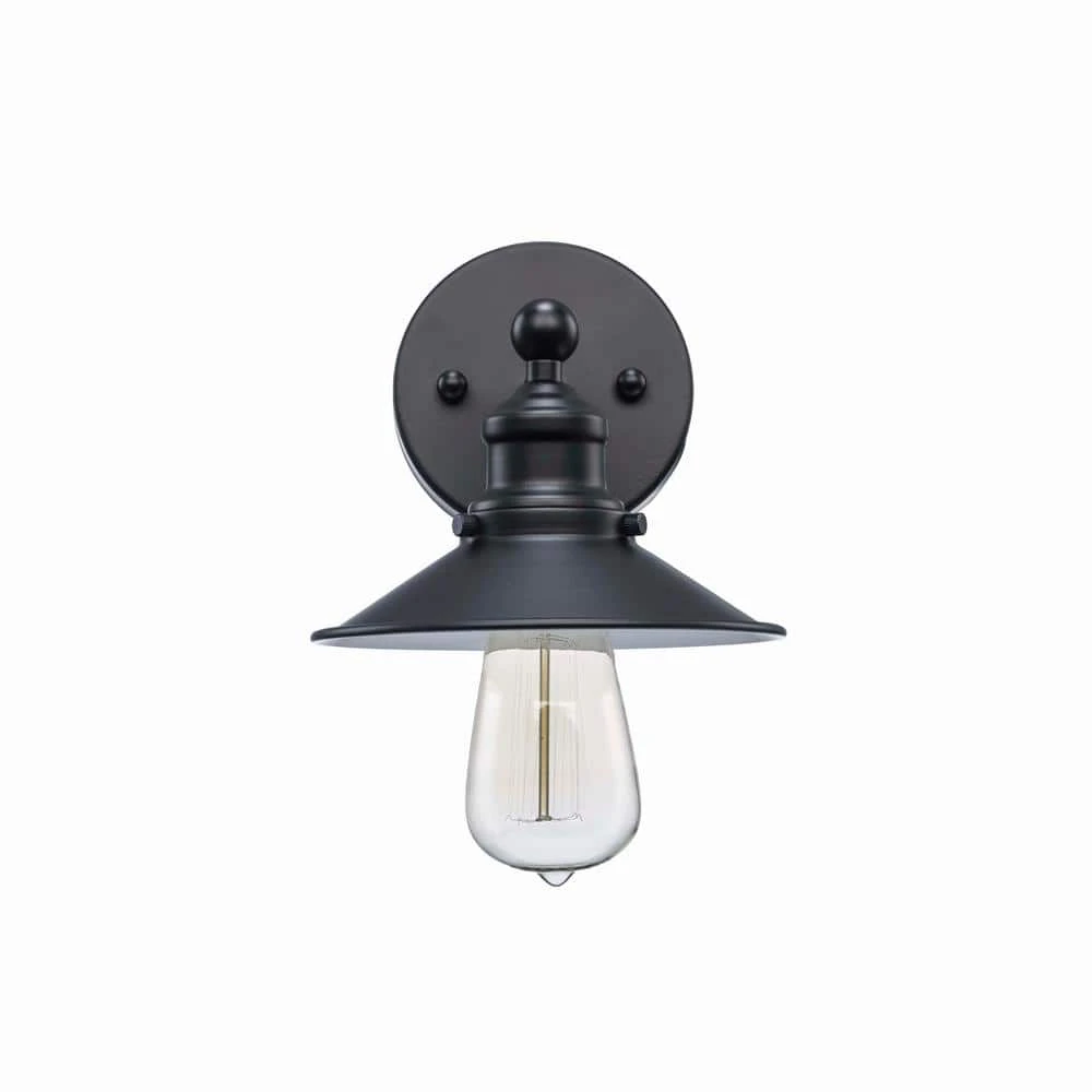 Hampton Bay’s Glenhurst Collection exhibits bold, retro wall lighting that will add an old-fashioned industrial feel to a variety of indoor applications. The Glenhurst single light wall sconce is featured in a classic black finish, making it perfect for complimenting farmhouse or industrial style decors. The domed metal shade can be mounted upwards or downwards, offering directional lighting in bathrooms, powder rooms, hallways and more. This fixture is mounted with a matching round back plate and has a straight arm detail holding the shade in place. Showcase this wall sconce with a vintage Edison style filament bulb (not included) to add a warm and rustic glow to your space.
