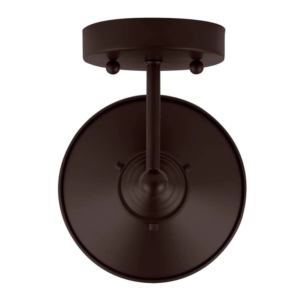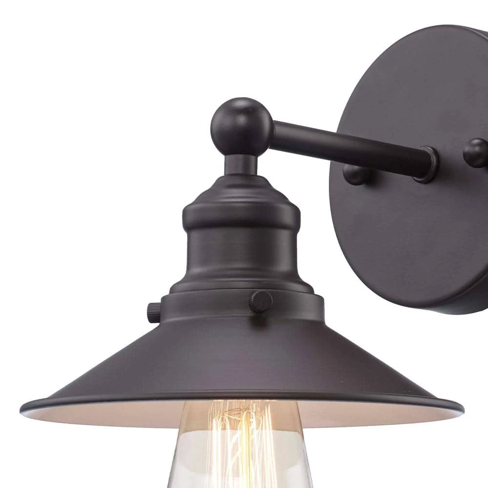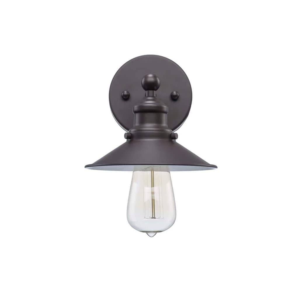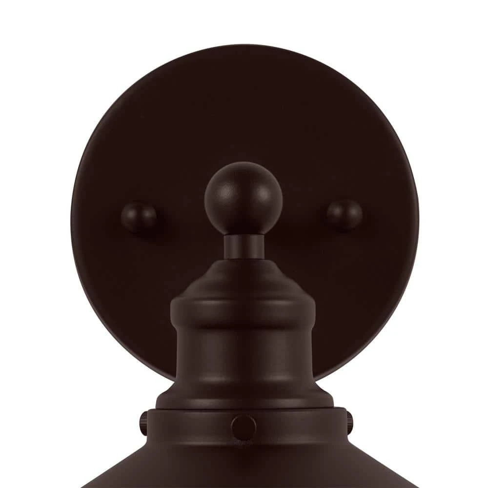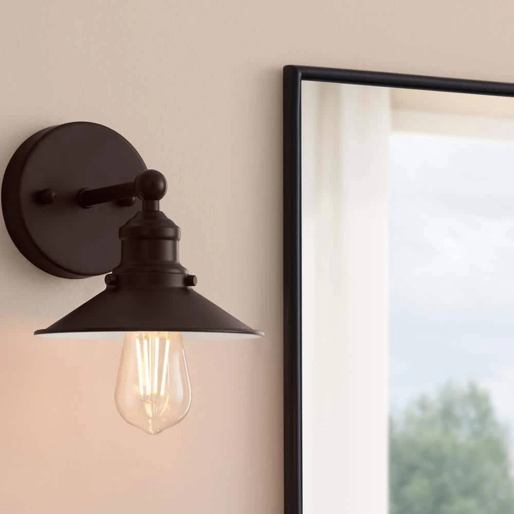 Hampton Bay’s Glenhurst Collection exhibits bold, retro wall lighting that will add an old-fashioned industrial feel to a variety of indoor applications. The Glenhurst single light wall sconce is featured in a rustic bronze finish, making it perfect for complimenting farmhouse or industrial style decors. The domed metal shade can be mounted upwards or downwards, offering directional lighting in bathrooms, powder rooms, hallways and more. This fixture is mounted with a matching round back plate and has a straight arm detail holding the shade in place. Showcase this wall sconce with a vintage Edison style filament bulb (not included) to add a warm and rustic glow to your space.