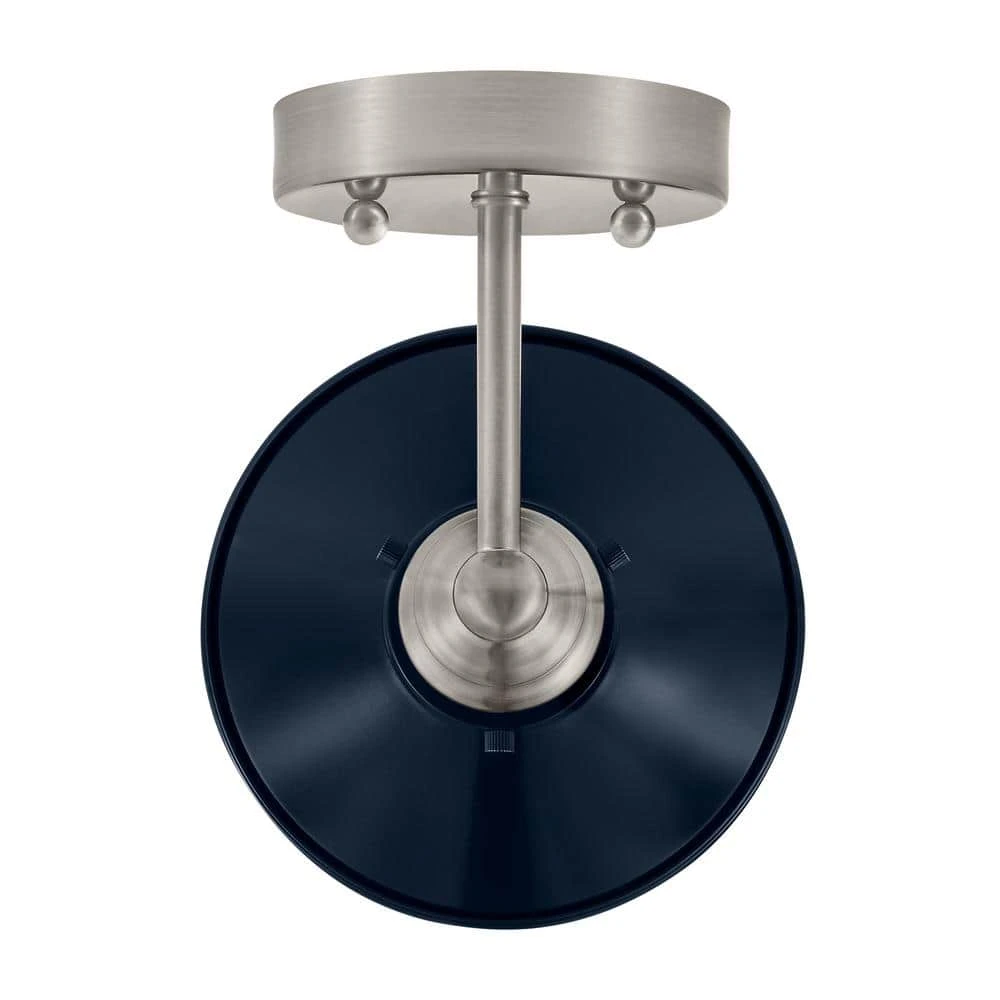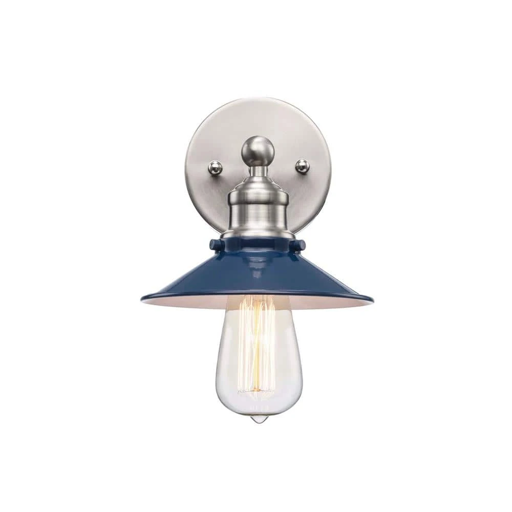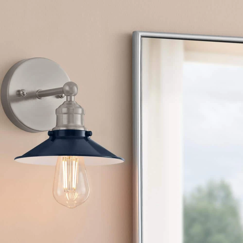 Hampton Bay’s Glenhurst Collection exhibits bold, retro wall lighting that will add an old-fashioned industrial feel to a variety of indoor applications. The Glenhurst single light wall sconce is featured in a neutral brushed nickel finish with cobalt blue detailing, adding a pop of color to compliment a wide variety of interior decor styles. The domed metal shade can be mounted upwards or downwards, offering directional lighting in bathrooms, powder rooms, hallways and more. This fixture is mounted with a matching round back plate and has a straight arm detail holding the shade in place. Showcase this wall sconce with a vintage Edison style filament bulb (not included) to add a warm and rustic glow to your space.