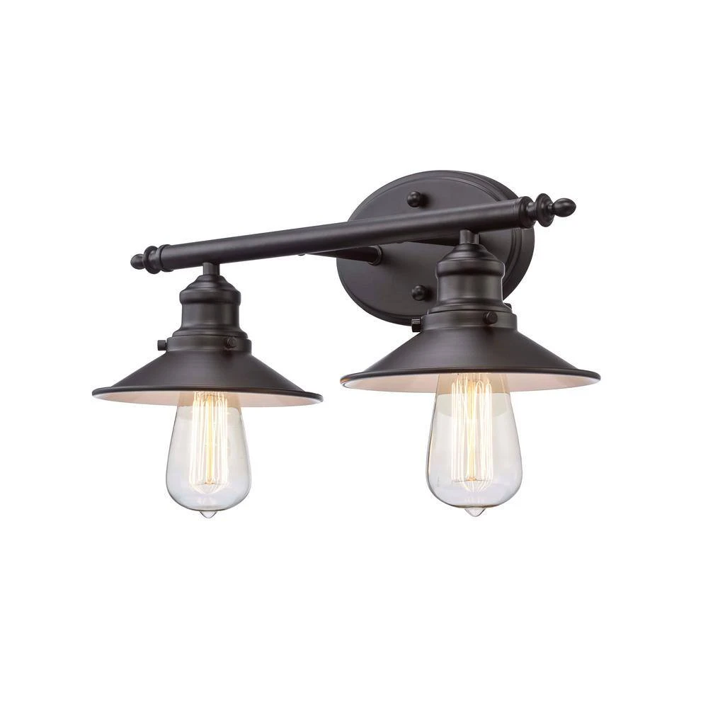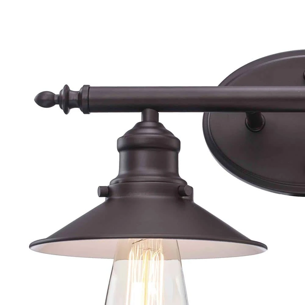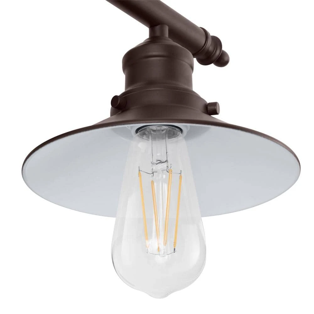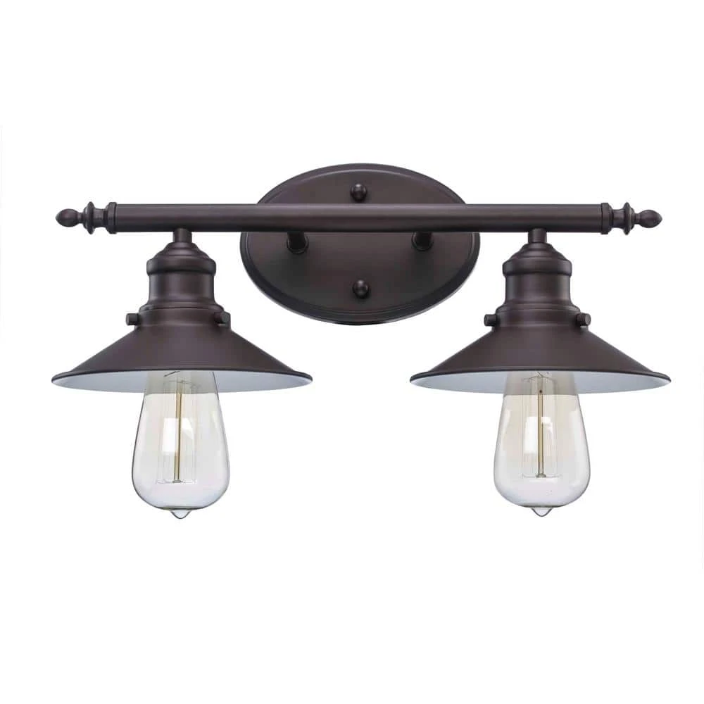 Hampton Bay’s Glenhurst Collection exhibits bold, retro vanity lighting that will add an old-fashioned industrial feel to bathroom and powder room areas. Each of the unique light sockets features a domed metal shade in a rustic bronze finish, making this piece the perfect accent for farmhouse or industrial style decors. This fixture is mounted with a stylish oval back plate and has straight arm detail holding the 2 shades in place. A reversible mounting feature gives you the option of installing this light with the shades facing upwards or downwards for directional light. Showcase this fixture with 2 vintage Edison style filament bulbs (not included) to add a warm glow to your space.