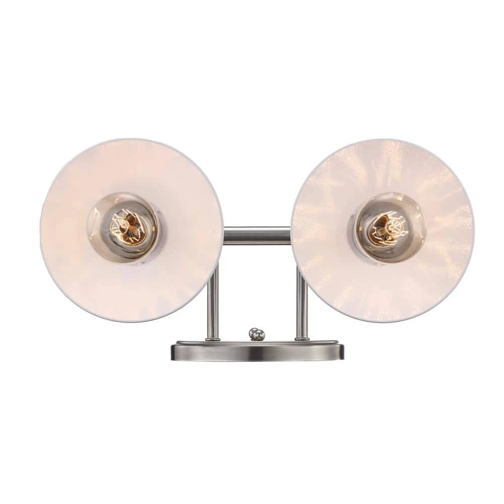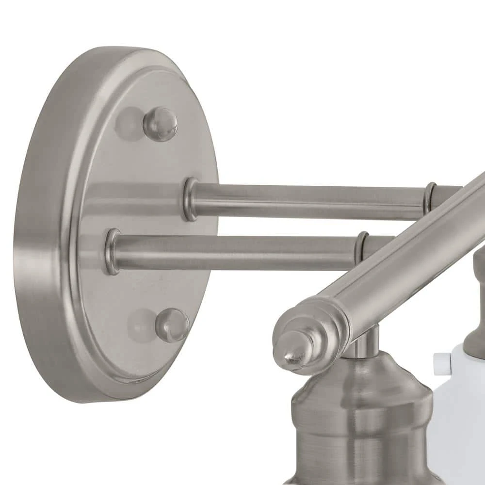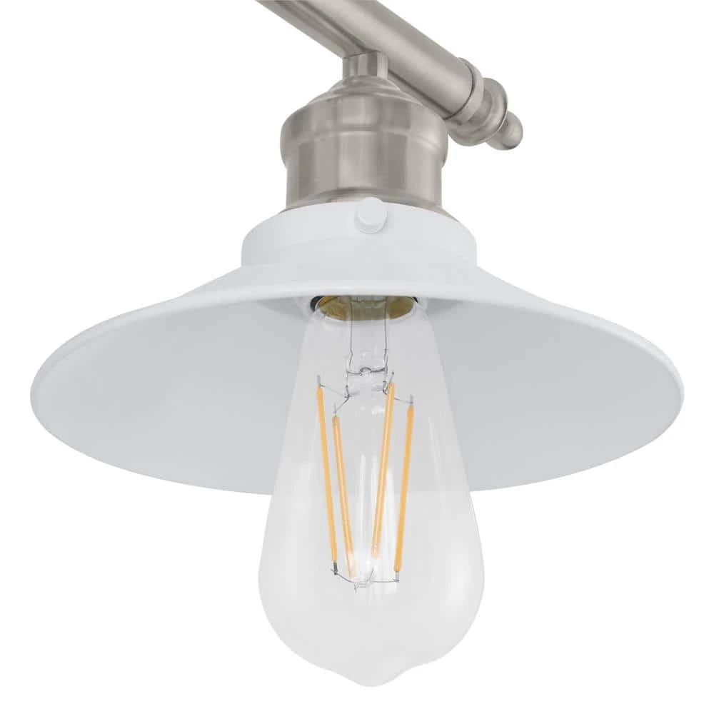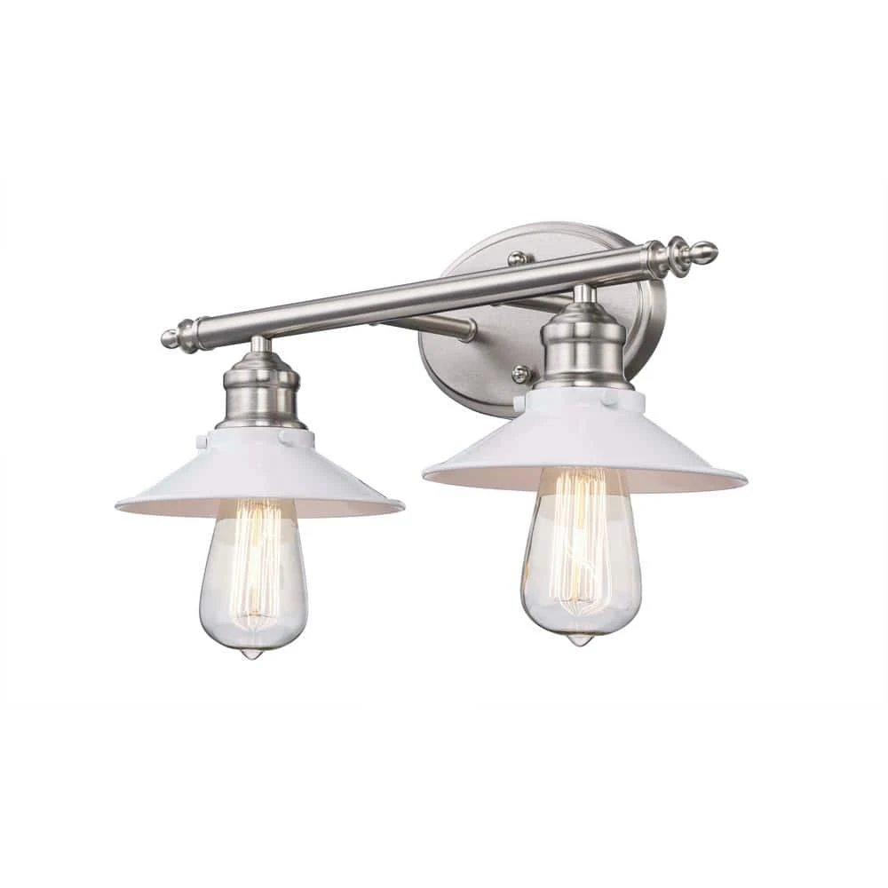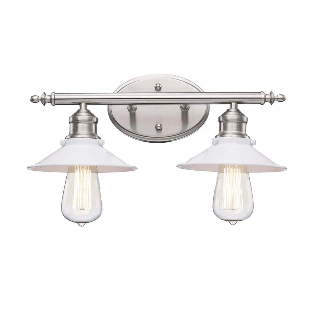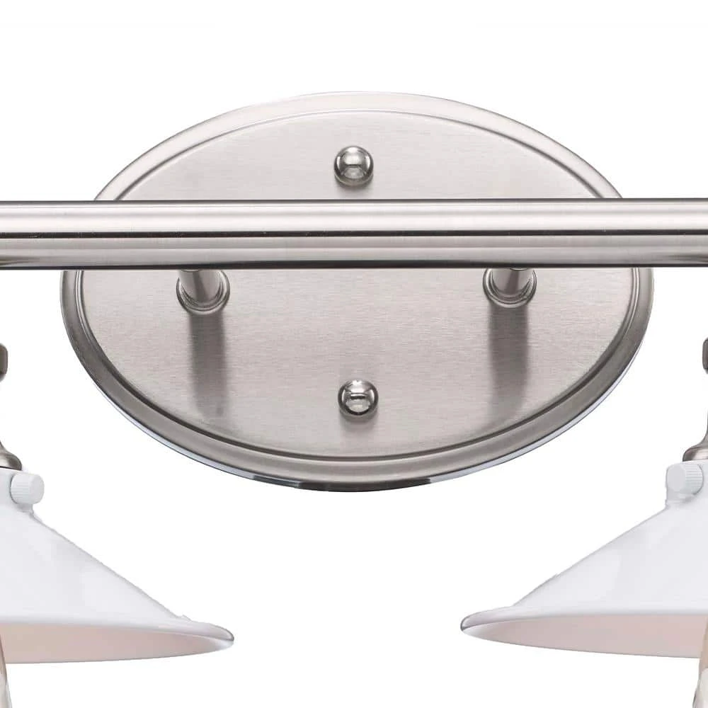 Hampton Bay’s Glenhurst Collection exhibits bold, retro vanity lighting that will add an old-fashioned industrial feel to bathroom and powder room areas. The Glenhurst 2-light vanity bar is featured in a brushed nickel finish with white metal detailing, adding a trendy 2-toned color scheme that will compliment a wide variety of interior decor styles. This fixture is mounted with a stylish oval back plate and has straight arm detail holding the 2 shades in place. A reversible mounting feature gives you the option of installing this light with the domed shades facing upwards or downwards for directional light. Showcase this fixture with 2 vintage Edison style filament bulbs (not included) to add a warm glow to your space.