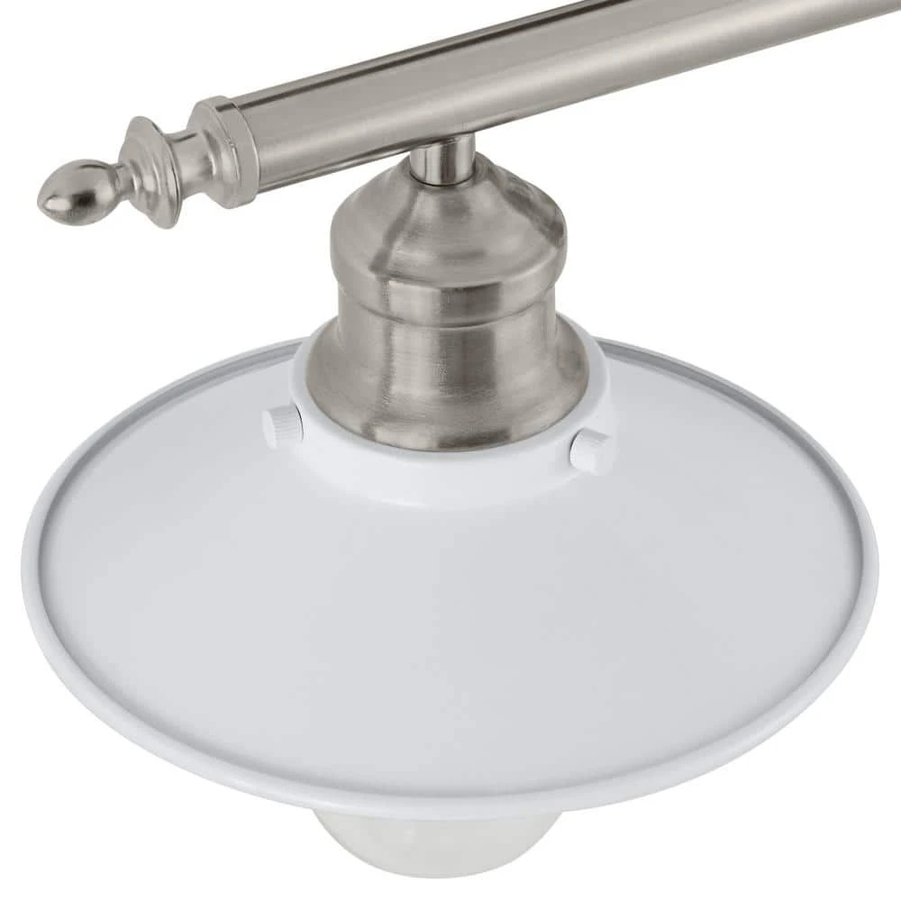 - Brushed nickel finish with white metal shade
