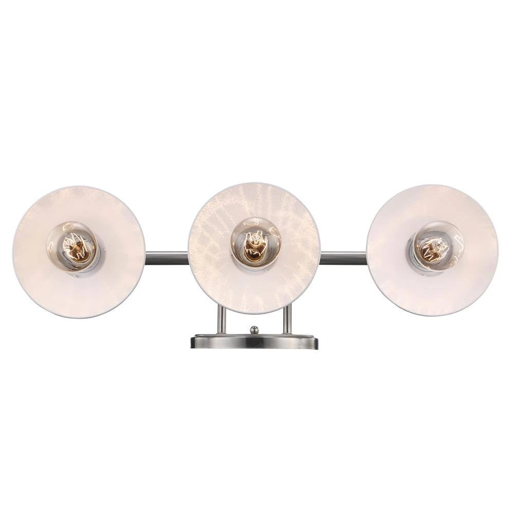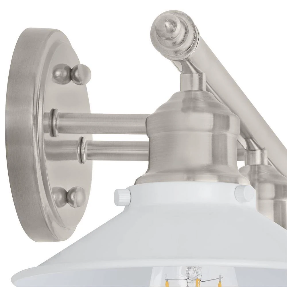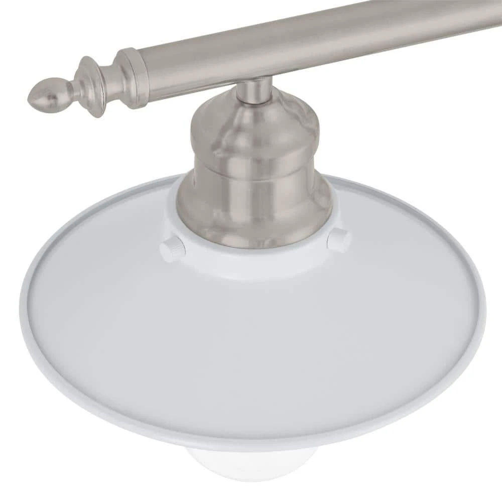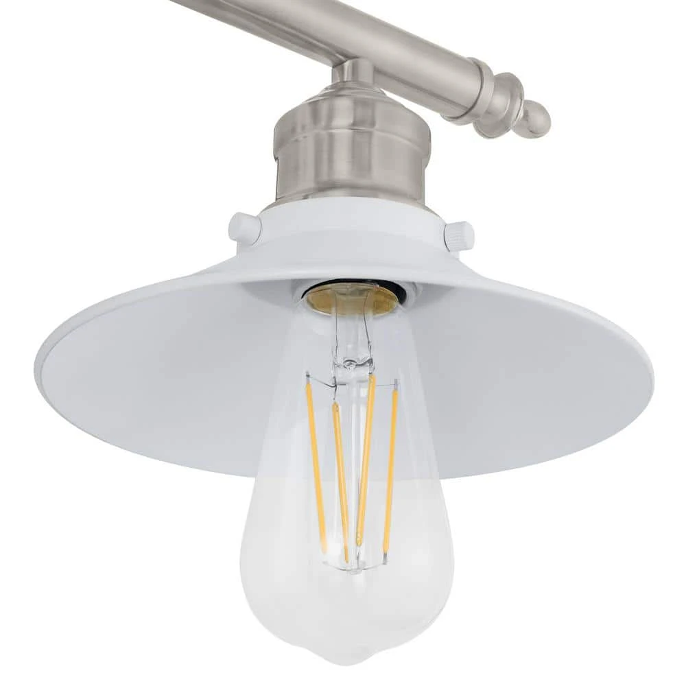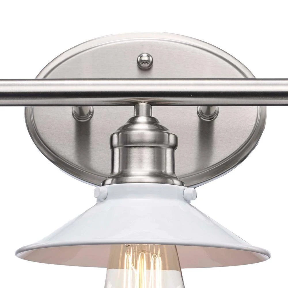 Hampton Bay’s Glenhurst Collection exhibits bold, retro vanity lighting that will add an old-fashioned industrial feel to bathroom and powder room areas. The Glenhurst 3-light vanity bar is featured in a brushed nickel finish with white metal detailing, adding a trendy 2-toned color scheme that will compliment a wide variety of interior decor styles. This fixture is mounted with a stylish oval back plate and has straight arm detail holding the 3 shades in place. A reversible mounting feature gives you the option of installing this light with the domed shades facing upwards or downwards for directional light. Showcase this fixture with 3 vintage Edison style filament bulbs (not included) to add a warm glow to your space.