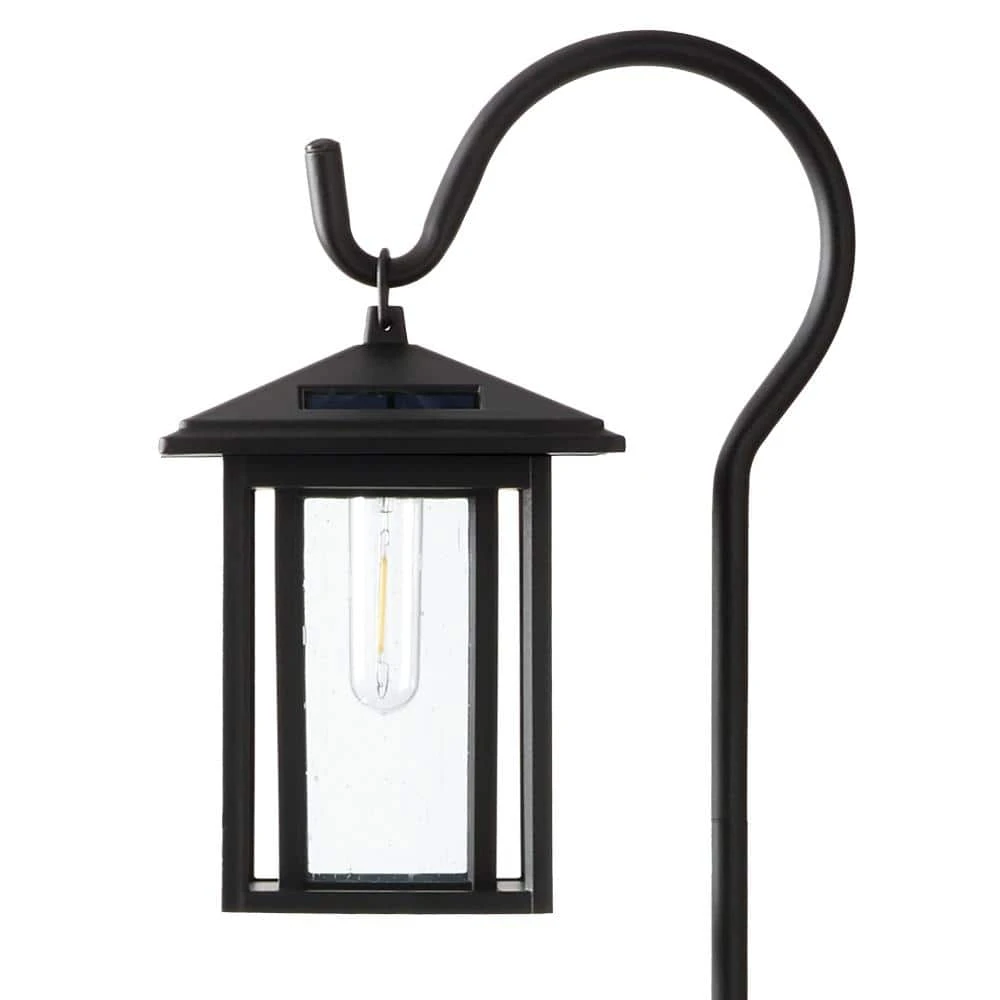 Add a touch of vintage elegance to your landscape with the Hampton Bay Grantville Solar Shepherd Hook Path Light 2-pack. These lights feature a unique filament style light design illuminated by an integrated LED. Installation is quick and easy with no wiring necessary. When fully charged, each light turns on automatically at dusk and produces a decorative 15 Lumens output. Perfect for illuminating pathways/walkways, entrance areas and garden focal points – the lights are virtually maintenance free for years of enjoyment.