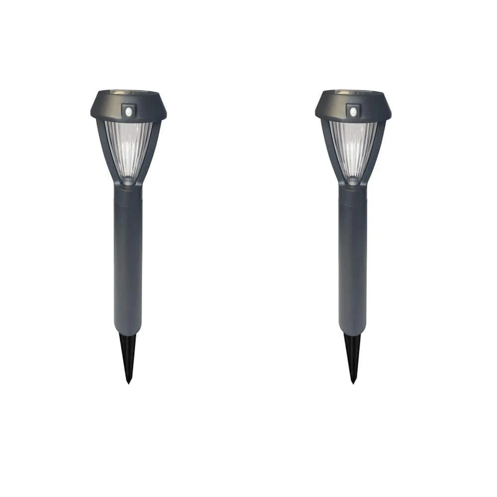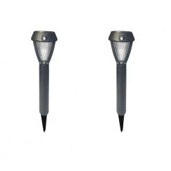 The 2-pack Hampton Bay Solar LED Pathway lights creates bright 3000K warm white lighting that is perfect for illuminating your driveway, walkway, patio or garden. Select the 15 Lumens setting and enjoy 8-hours of uninterrupted illumination. After 8 hours of use the light will turn off. When motion is detected, the light turns back on at 15 Lumens for 30 seconds. Or select the PIR option. In the PIR setting, the light remains off until motion is detected, at which time the light will turn on at 50 Lumens for 30 seconds. The black finish is applied to an aluminum top cap and bracket, stainless steel pole with polymeric stake for years of maintenance-free operation (no bulbs to replace). Included with your LED pathway light are all necessary hardware and battery(s).